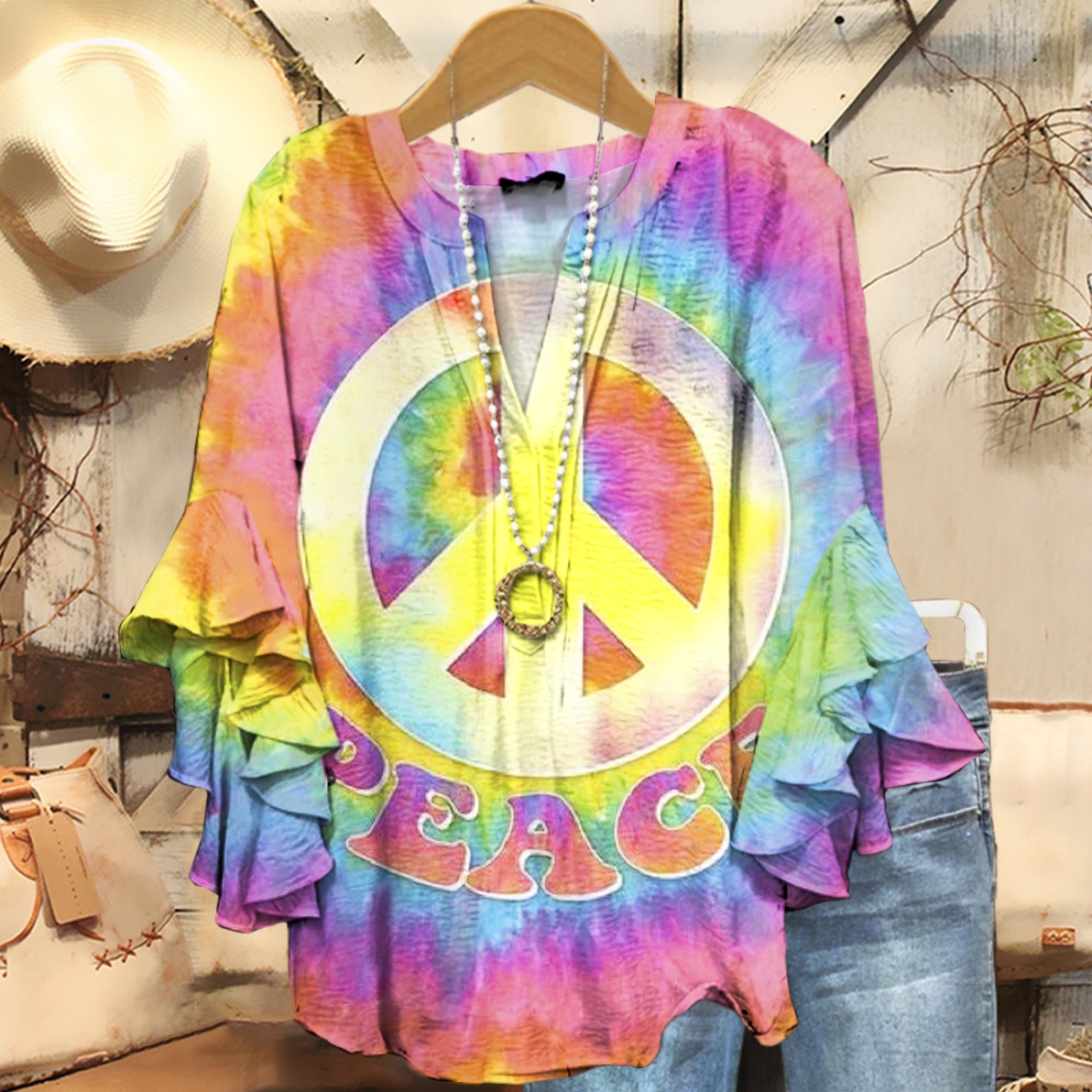 Womens Hippie Peace Tie Dye Pattern Print Casual Ruffle Sleeve Top$36.99 USD
