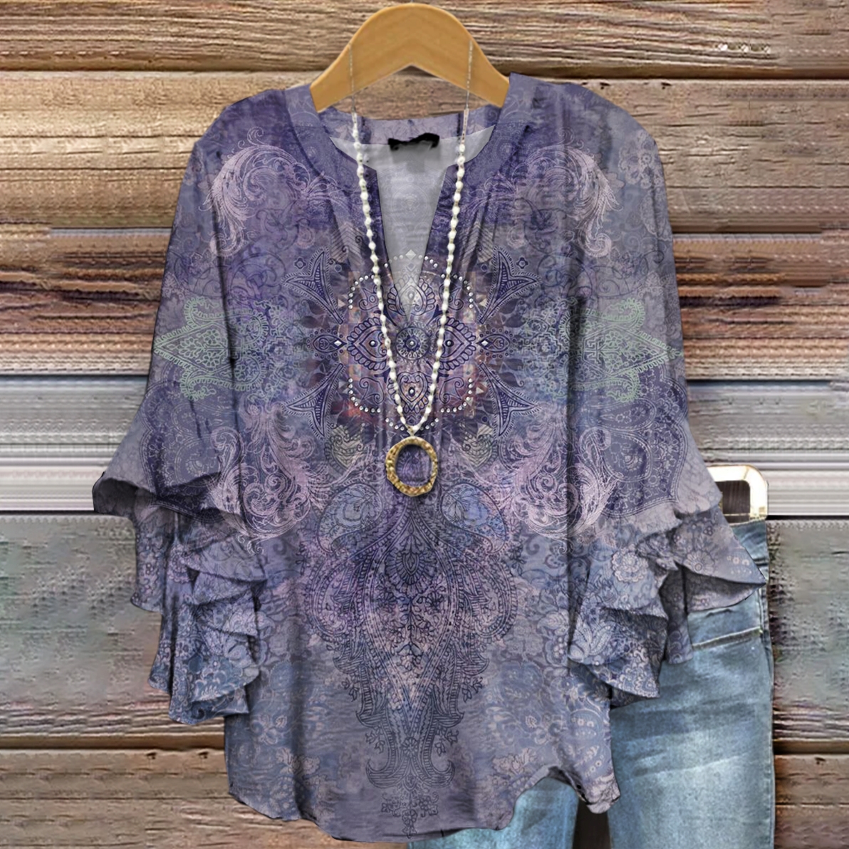 Women's Art Painting Ethnic Floral Contrast Retro Print V-Neck Ruffled Top$36.99 USD -