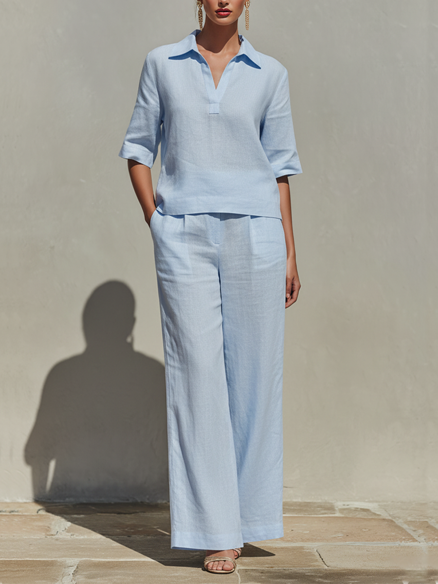 Women's Sky Blue Linen Two-Piece Set With Collared V-Neck Top & High-Waisted Wide-Leg Pants, Timeless Minimalist-Resort Style Set MDZ0245D1I$47.60 USD -