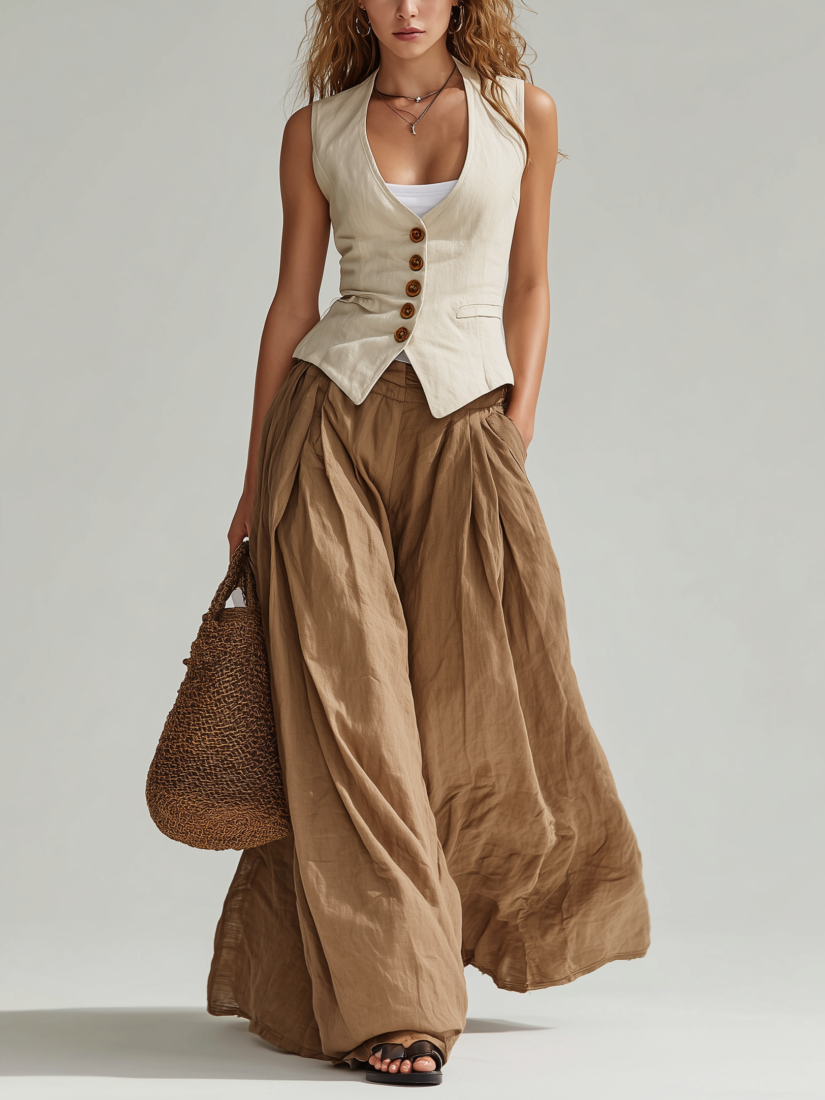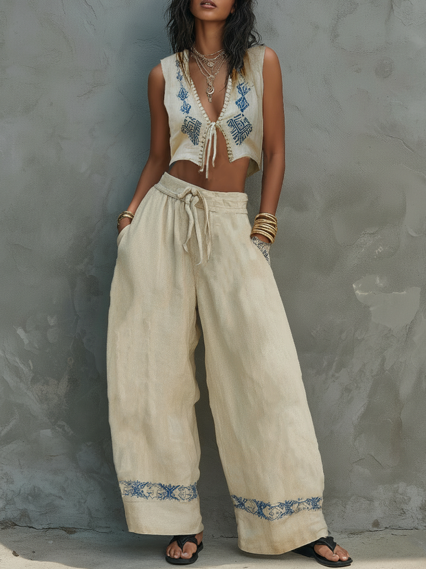 Women's Minimalist Linen-Blend Set: Tie-Front Vest & Embroidered Wide-Leg Pants MDZ0259D7Y$55.78 USD -