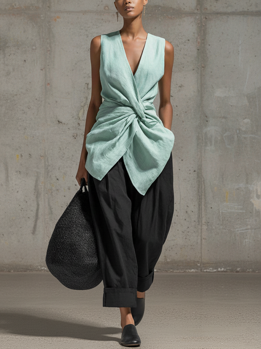 Women's Minimalist Linen-Blend Asymmetrical Sleeveless Shirt & Wide-Leg Pants Set MDZ0860D2Y$62.60 USD -