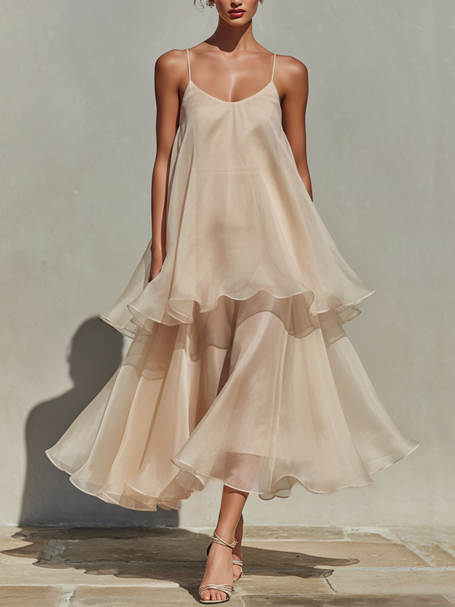 Women's Champagne Chiffon Midi Dress With Spaghetti Straps & Layered Ruffle Hem, Timeless Romantic-Resort Style Dress MDZ3021C4I$60.27 USD -