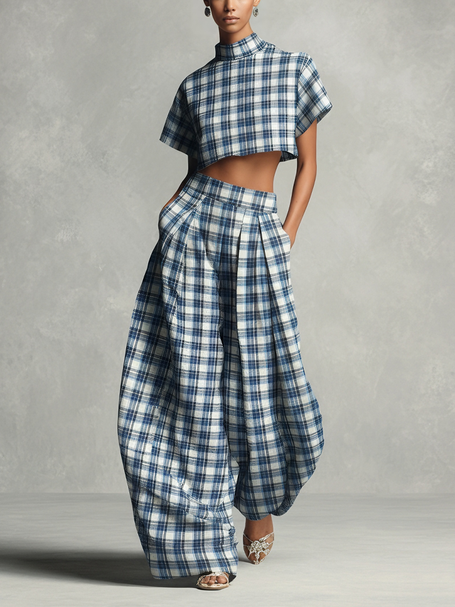 Save $88.68Women's Bold Cotton Blue & White Plaid Turtleneck Cropped Top & Lantern Wide-Leg Pants Set MDA2591L3AU$60.27 USD $148.95 USD -