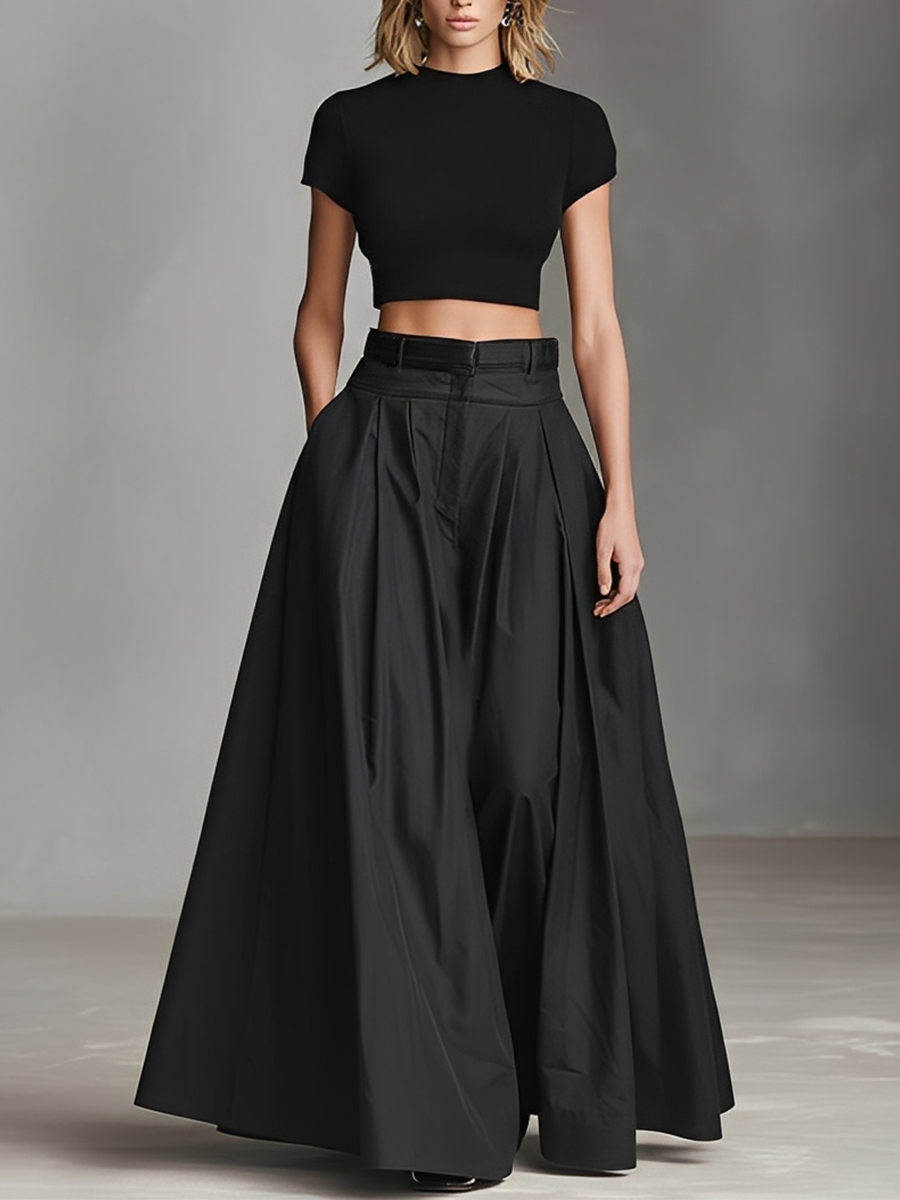 Women's Black Stretch-Knit & Woven Set With Cropped Top & Maxi Dress, Timeless Sleek-Chic Style Set (without Belt) MDZ1412A1I$62.47 USD -