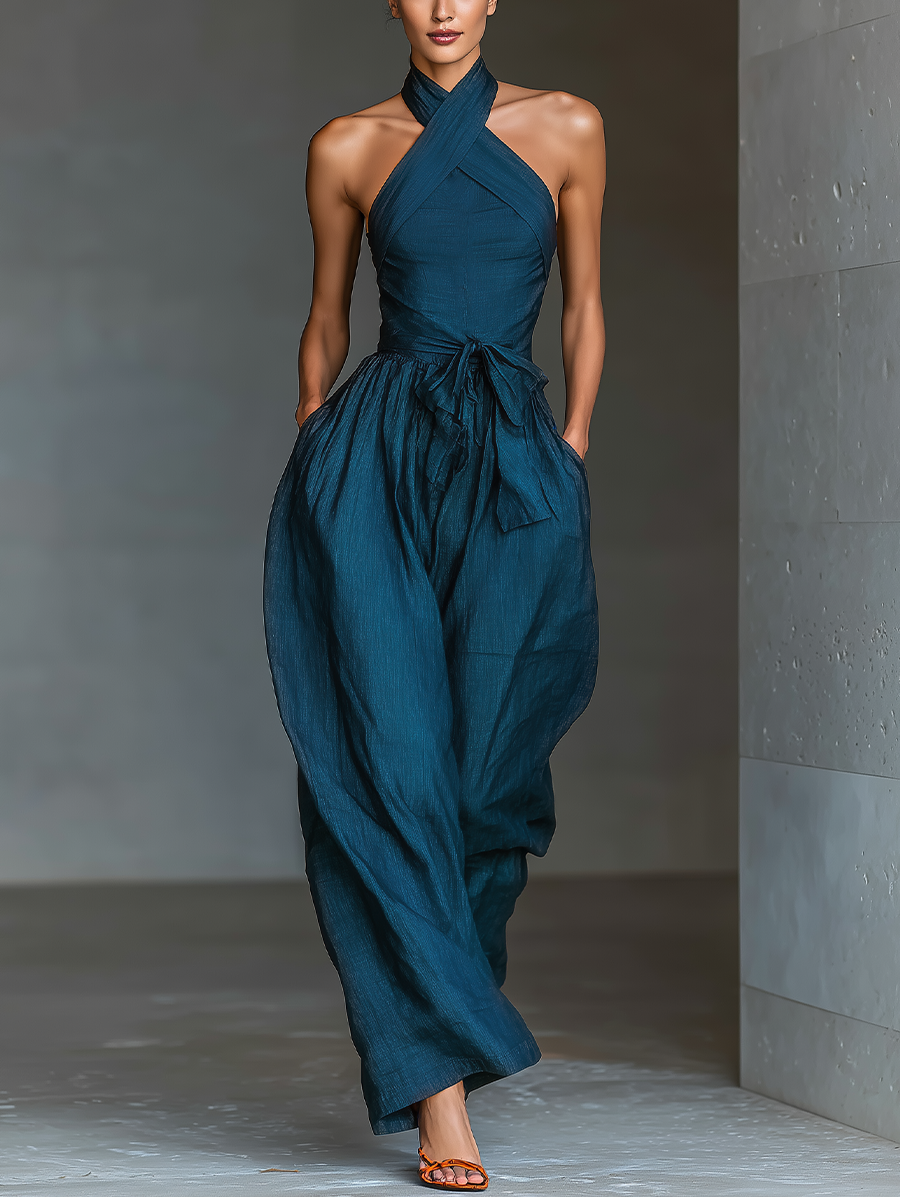 Women's Navy Blue Linen Fabric Cross Halter Wide-Leg Jumpsuit With Tie Waist & Side Pockets MDZ0455B5T$41.09 USD -