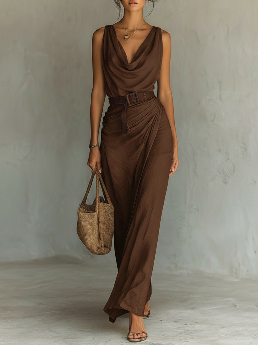 Women's Minimalist Cowl Neck Sleeveless Belted Maxi Dress MDZ1262A0Y$41.99 USD