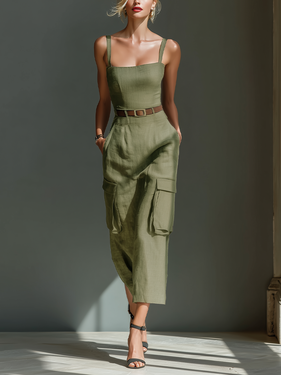 Women's Olive Green Linen Fabric Sleeveless Midi Dress With Cargo Pockets & Belted Waist MDZ2753A1T$41.90 USD -