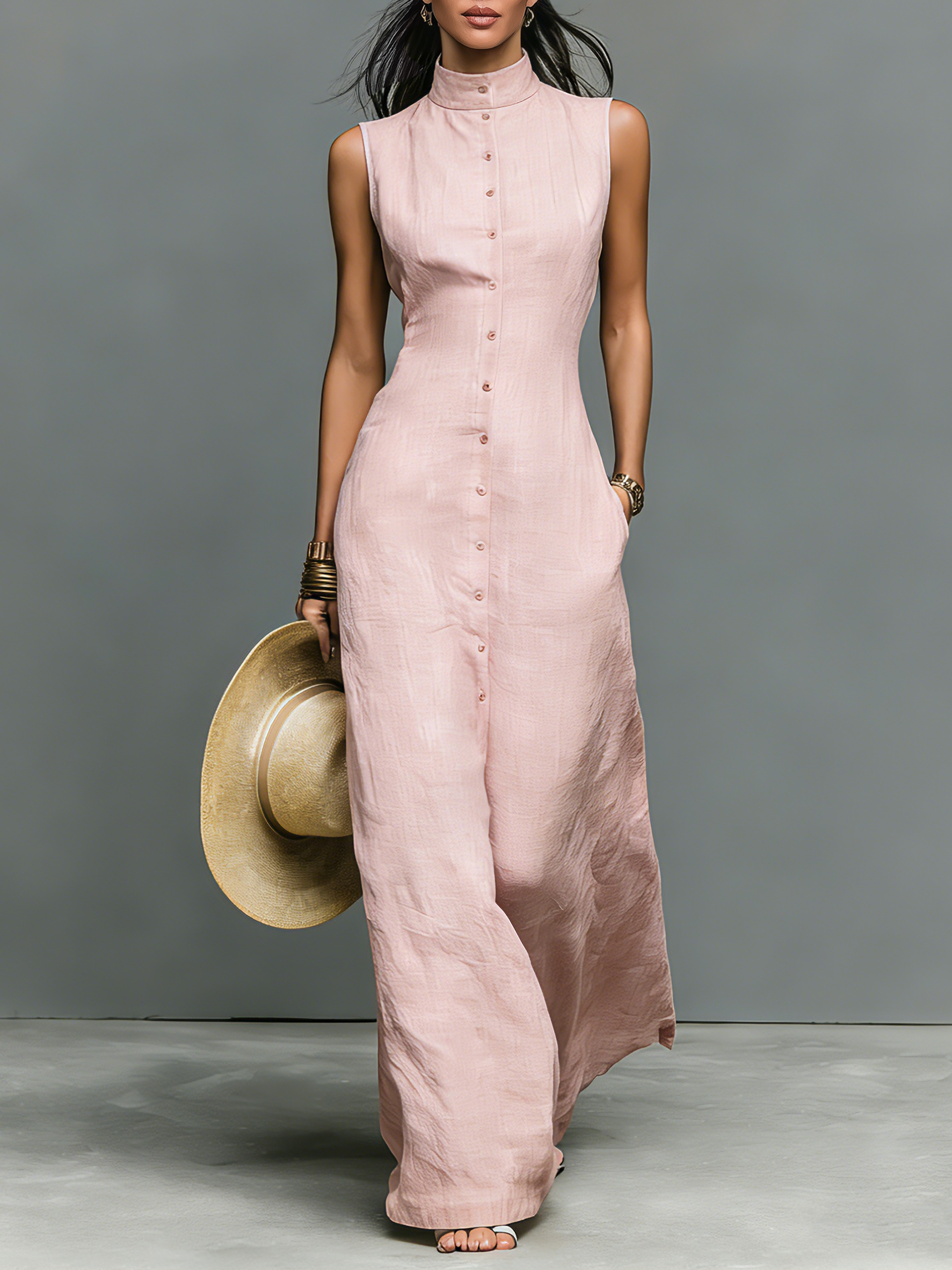 Women's Minimalist Linen-Blend Stand-Collar Single-Breasted Sleeveless Maxi Dress MDZ1049C1Y$41.99 USD -