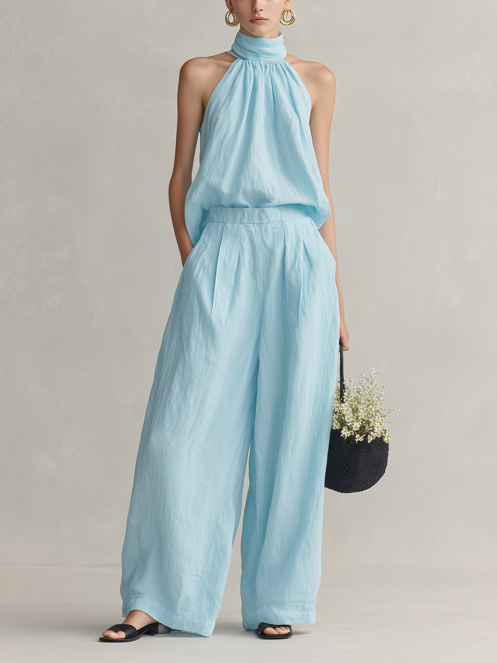 Women's Elegant Light Blue Cotton-Linen Round-Neck Sleeveless Top And Trousers Set MDZ2061C2AN$62.47 USD -