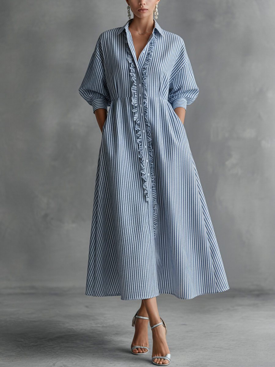 Women's Elegant Blue And White Striped Cotton Blend Ruffled Long Shirt Dress MDZ1834C0BA$50.37 USD -