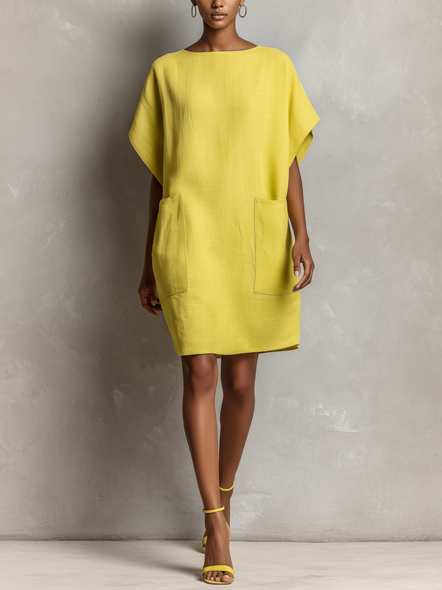 Women’s Lime Yellow Linen-Blend Batwing Sleeve Patch Pocket Shift Dress MDZ2671C3T$45.97 USD -