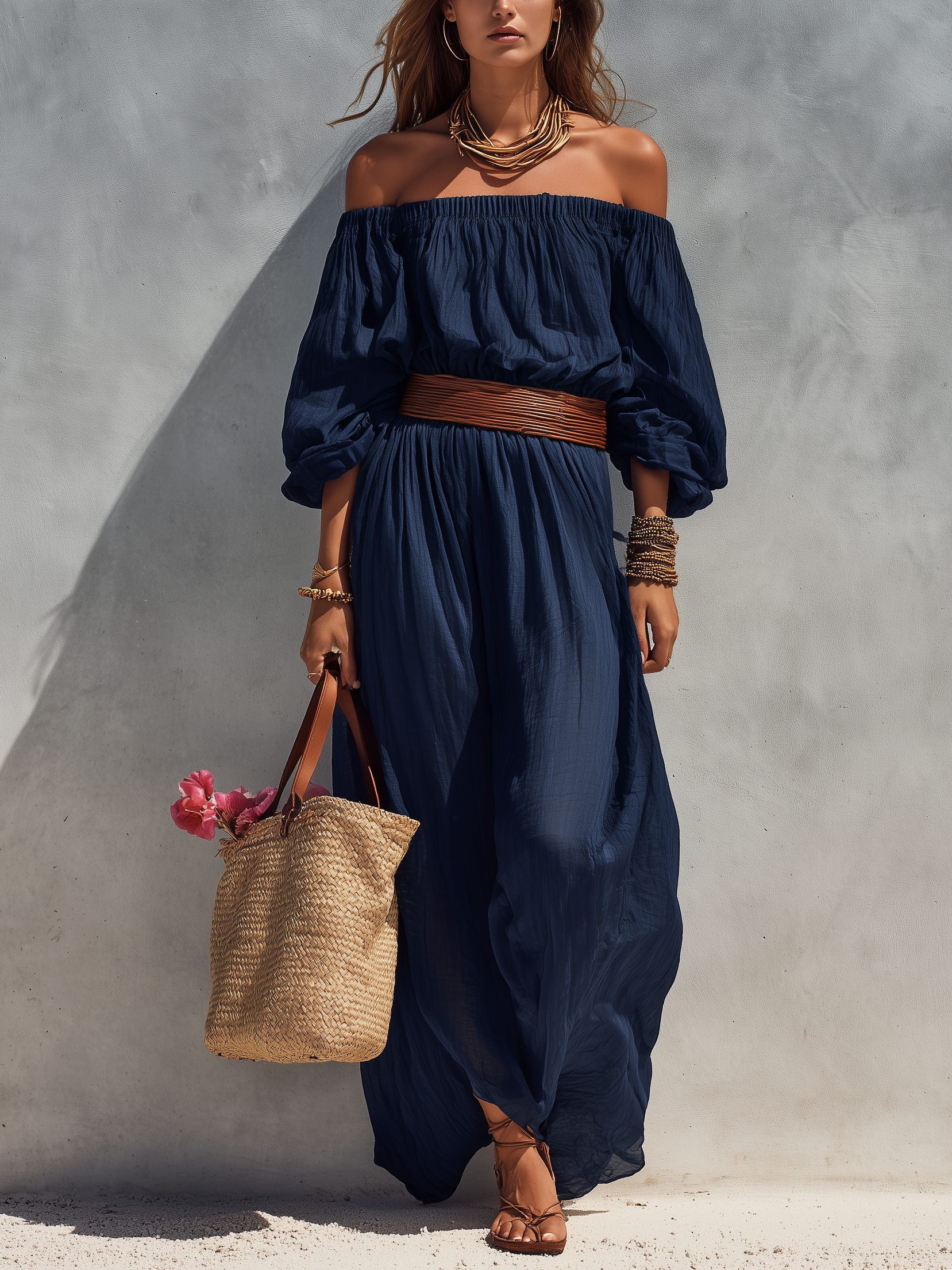 Women's Casual Dark Blue Cotton Linen Strapless Long-sleeved Dress (belt Not Included) MDZ1281C1AN$66.32 USD -