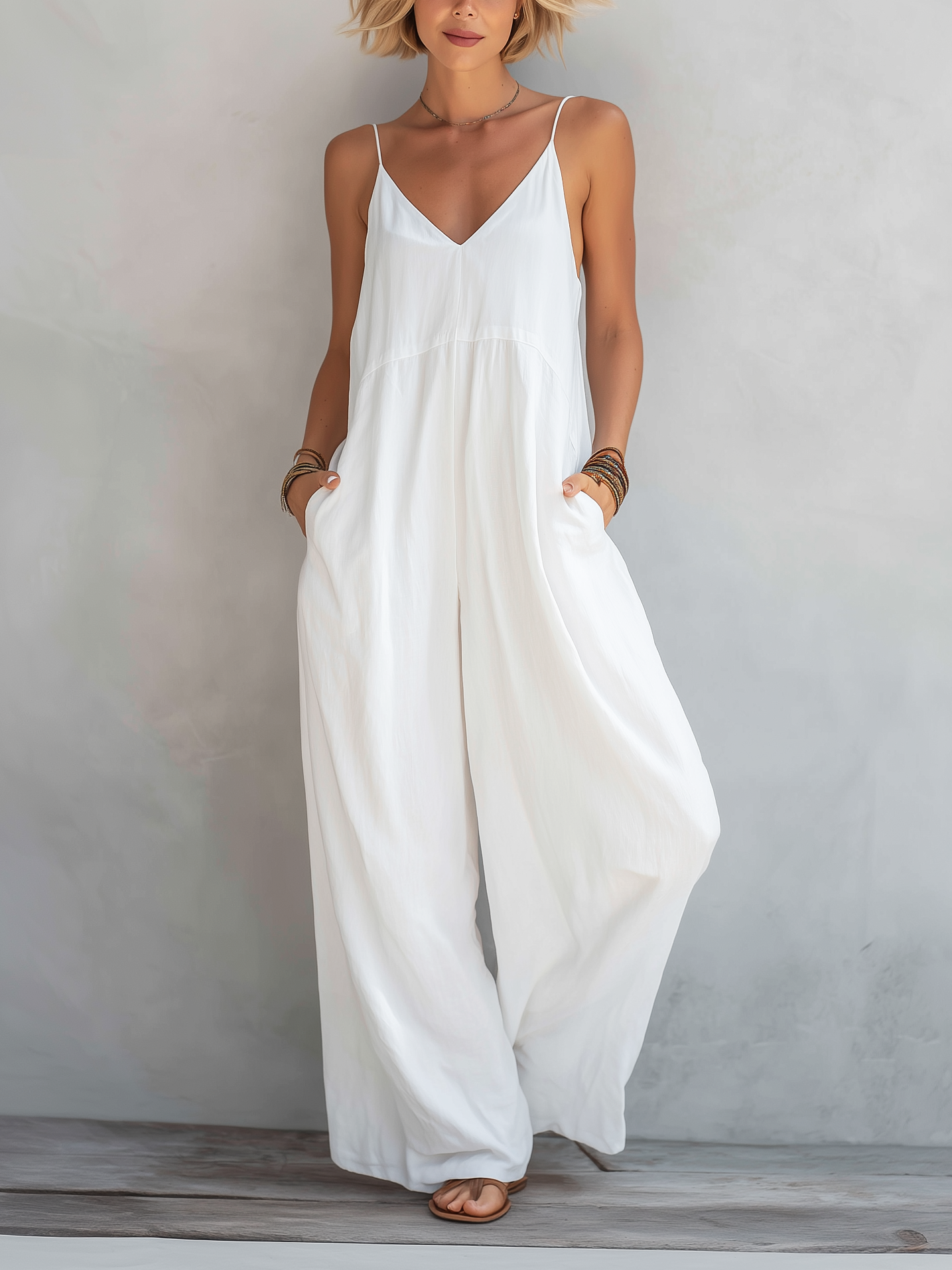 Women's Casual White Cotton-linen Blend Sleeveless Loose Jumpsuit MDZ0246C9AN$62.47 USD -