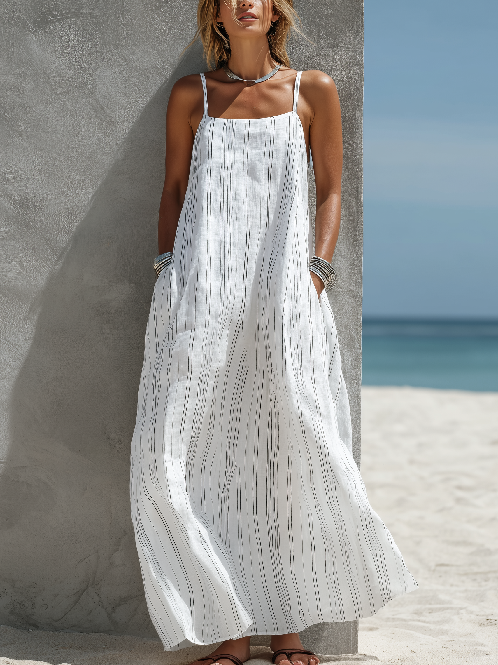 Women's Casual White Vertical Striped Woven Sleeveless Loose Long Dress MDZ0324C9AN$54.22 USD -