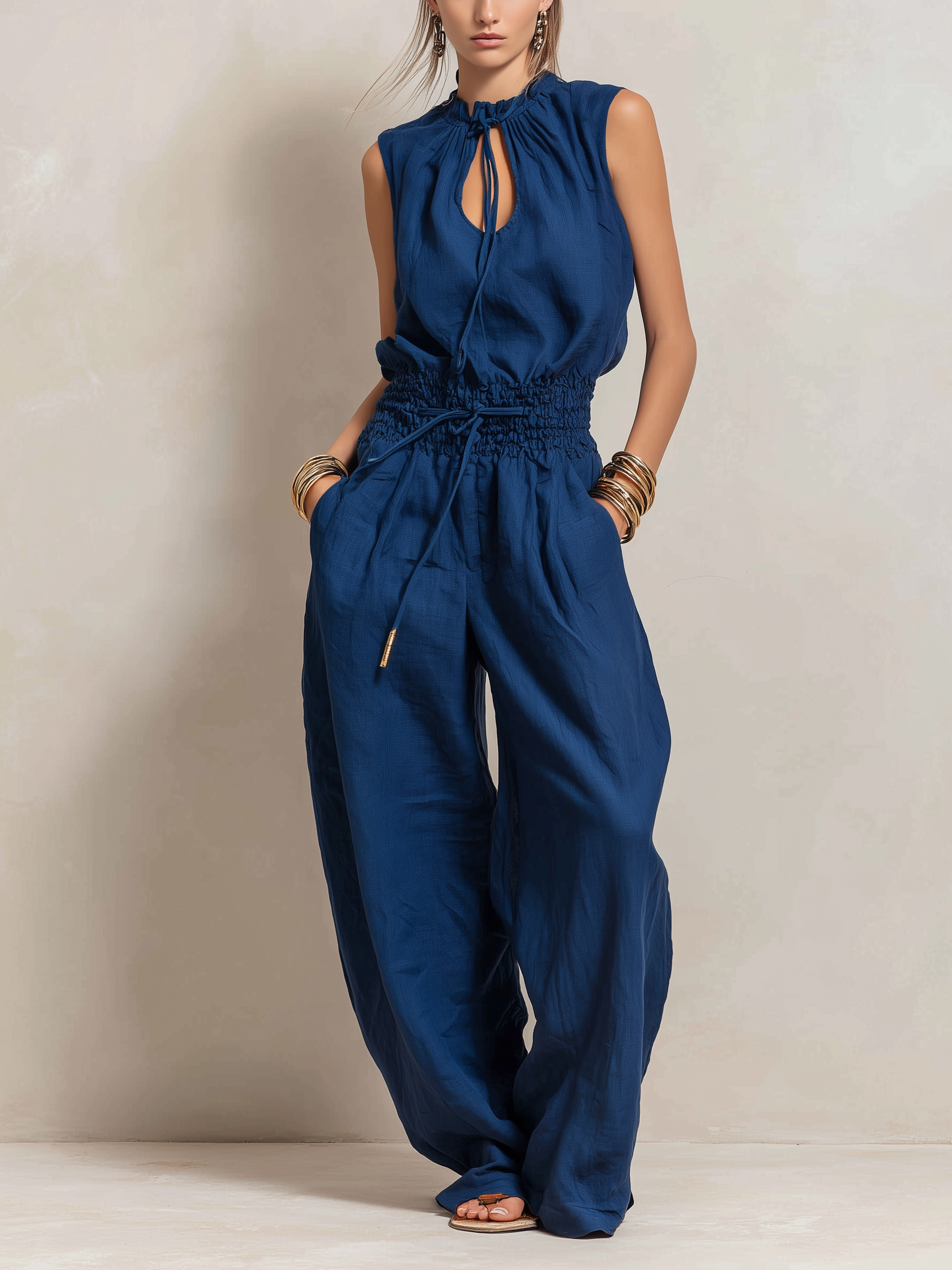 Women's Elegant Dark Blue Cotton-Linen Sleeveless Jumpsuit With Round Neck MDZ2068C2AN$54.77 USD -