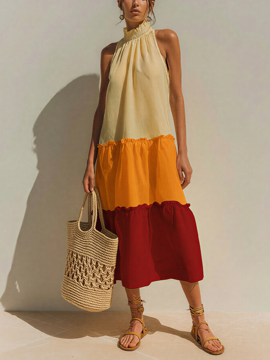 Women’s Cream Orange Red Colorblock Ruffle Hem Halter Neck Tiered Midi Dress MDZ0378D3T$45.97 USD