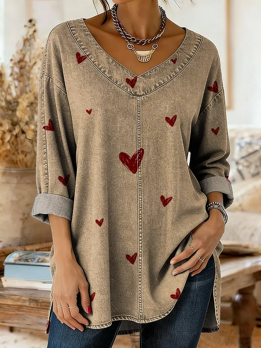 Women's Valentine's Day Heart Shape Art Print Casual Washed Denim Cotton Top$38.99 USD -