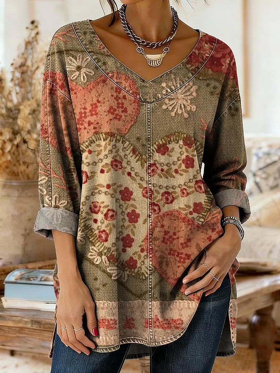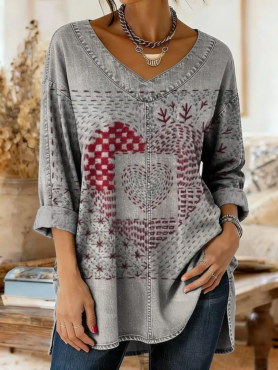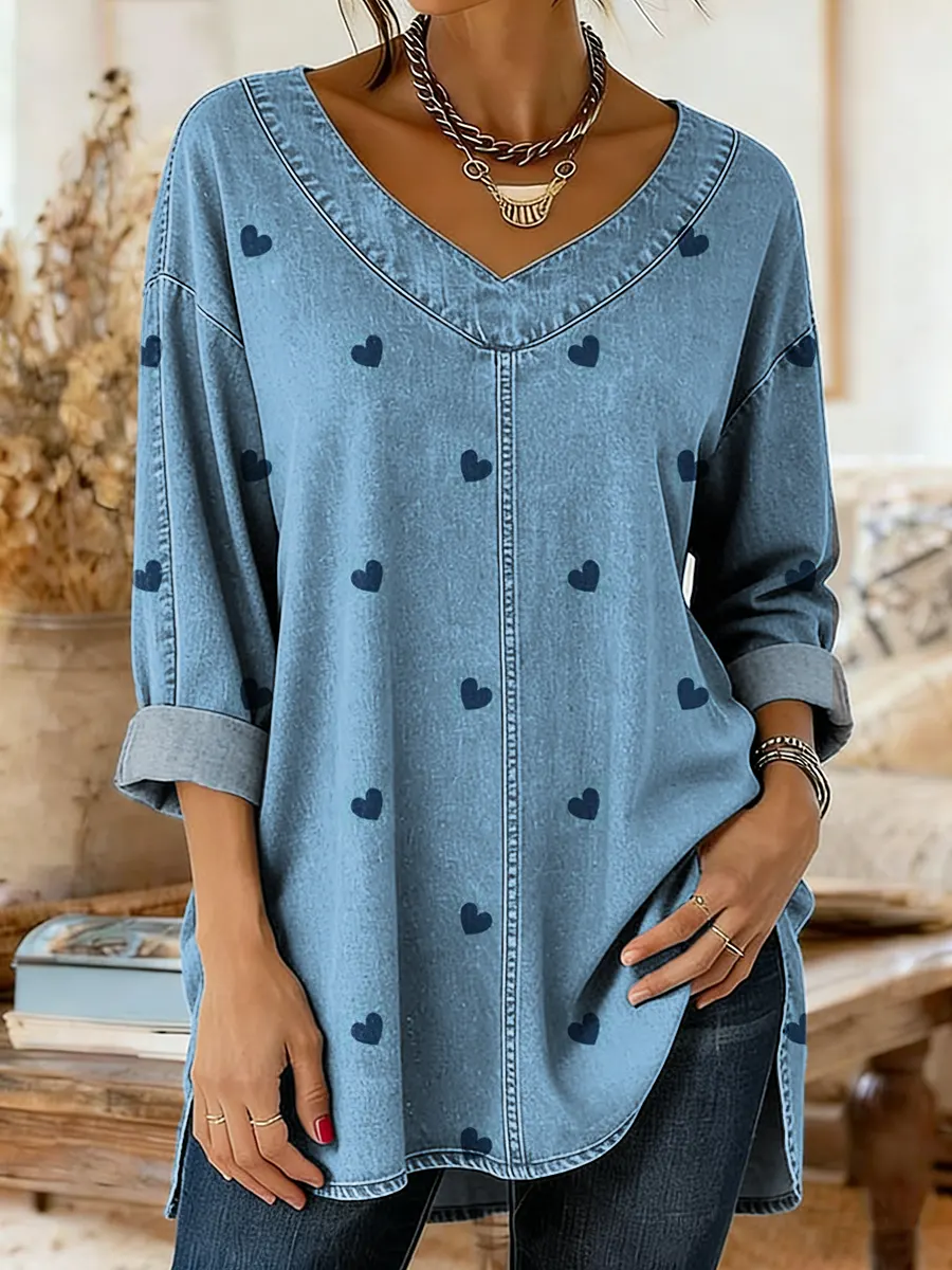 Women's Vintage Heart-patterned Textured Art Print Washed Denim Cotton Top$38.99 USD -