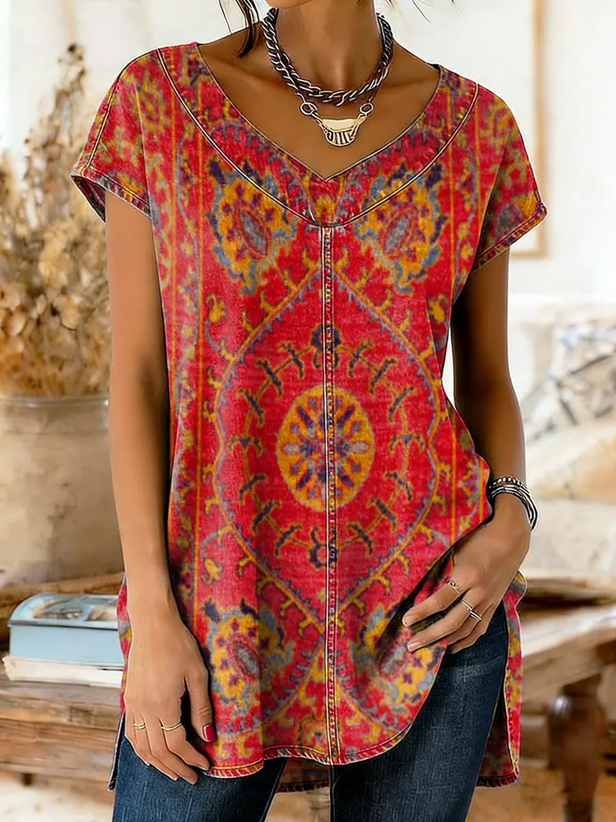 Retro Ethnic Floral Pattern Art Print Casual Washed Denim Cotton Top$38.99 USD -