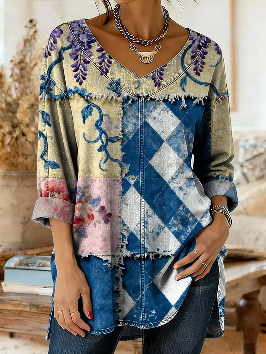 Women's Vintage Patchwork Pattern Art Print Casual Washed Denim Cotton Top$38.99 USD -