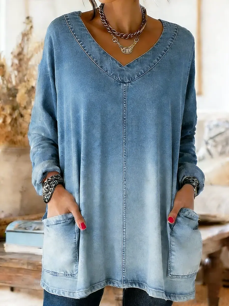 Women's Casual Long-Sleeve V-Neck Pocket Washed Cotton Denim Top$39.99 USD -