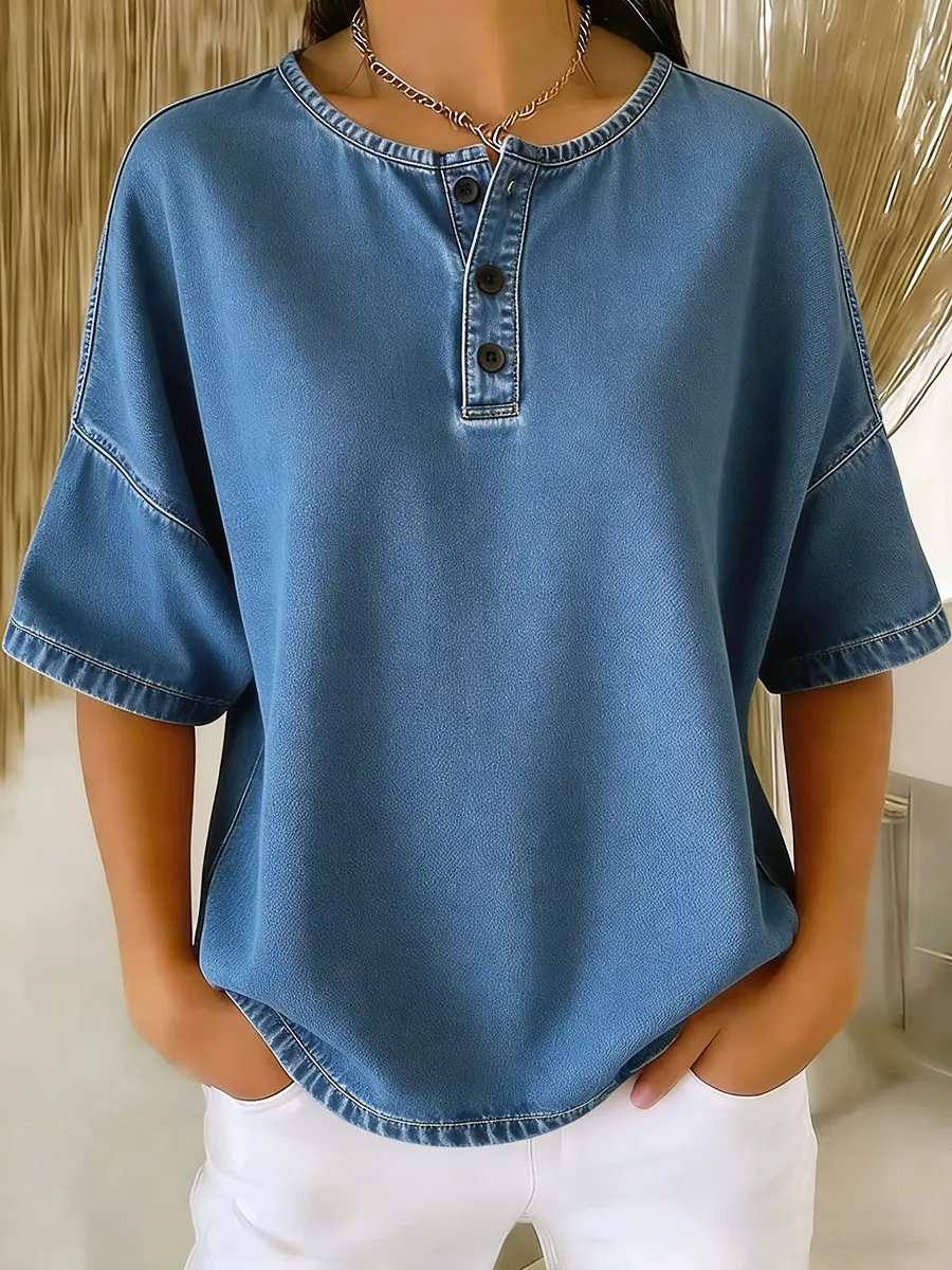 Women's Short-Sleeve Loose Washed Cotton Denim Top$39.99 USD -