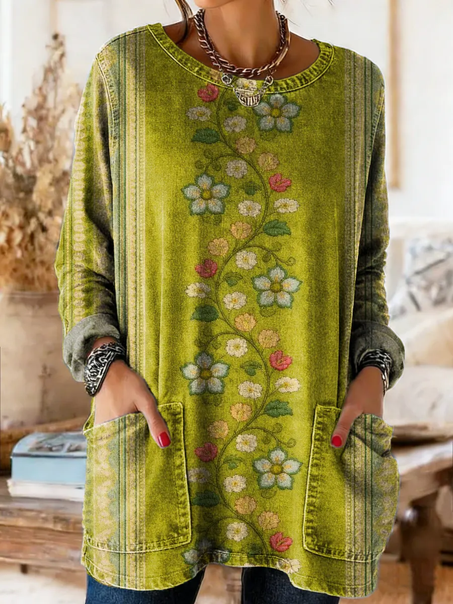 Ethnicity Texture Flowers Women's Art Print Casual Pocket Washed Denim Cotton Top$39.99 USD -