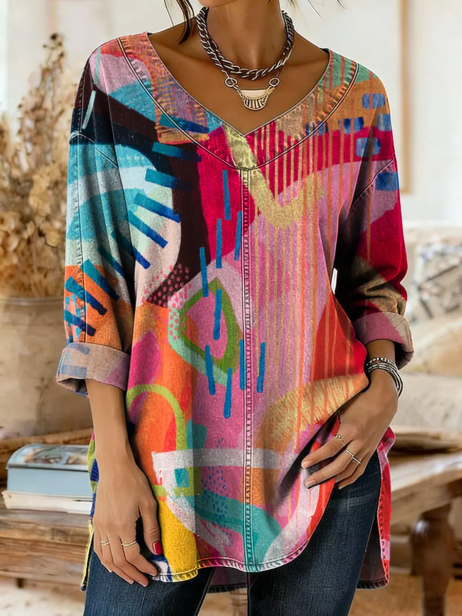 Ethnicity Colorful Geometry Abstract Women's Art Print Casual Washed Denim Cotton Top$38.99 USD -