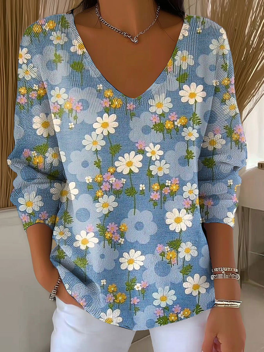 Women's Bohemian Ethnic Floral Art Print Casual V-neck Knitted Sweater$39.99 USD -