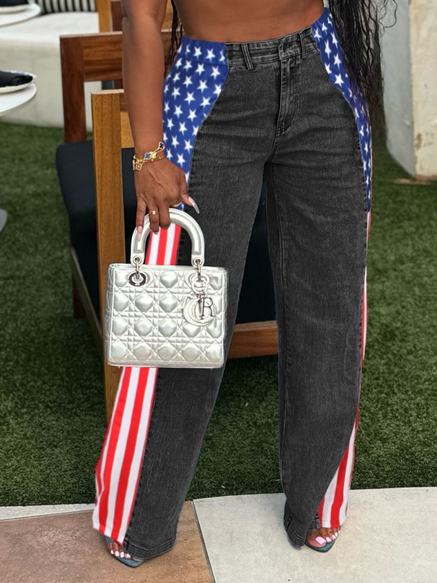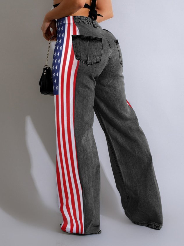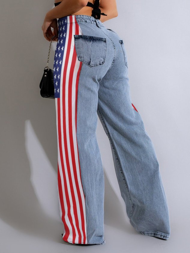 American Flag Denim Blue Straight Leg Button Fly Going Out Casual Jeans