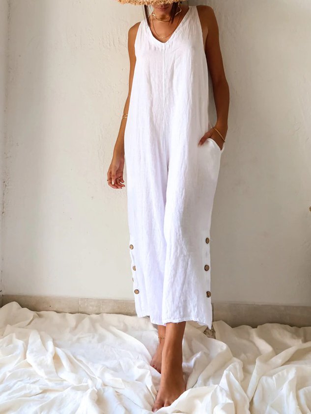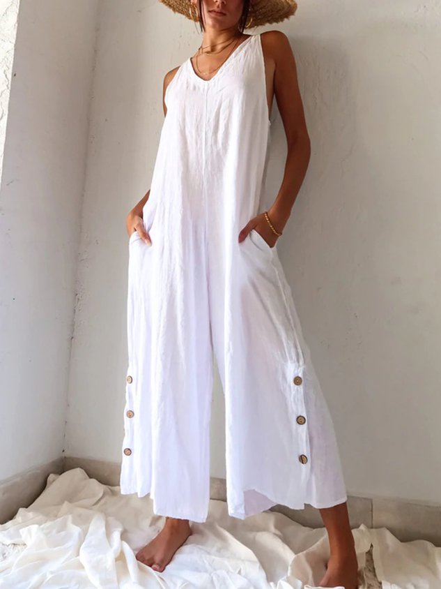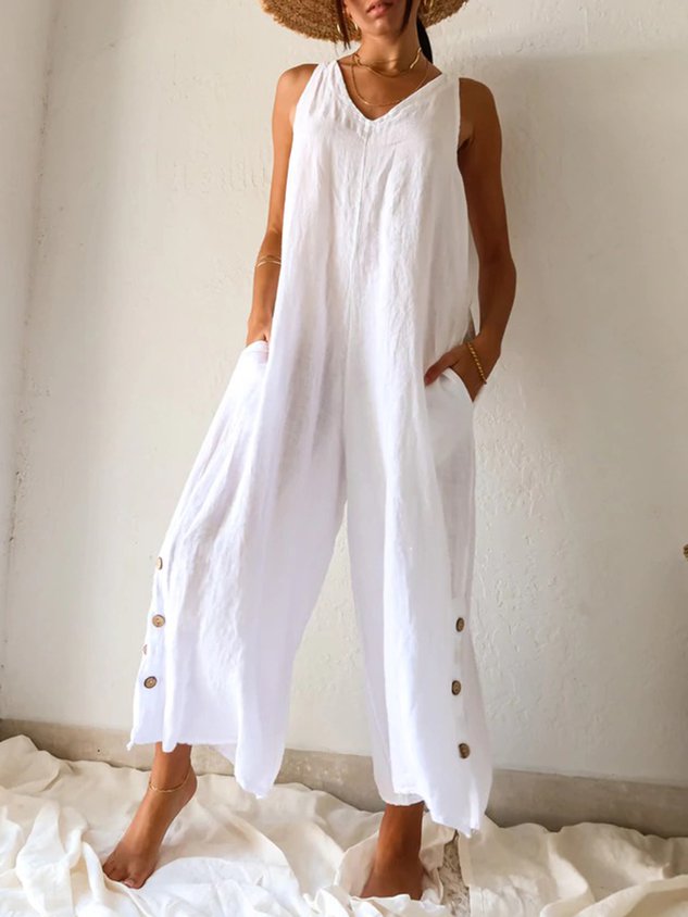 Casual V Neck Pockets Buttoned Cotton Solid Sleeveless Loosen Jumpsuit & Romper