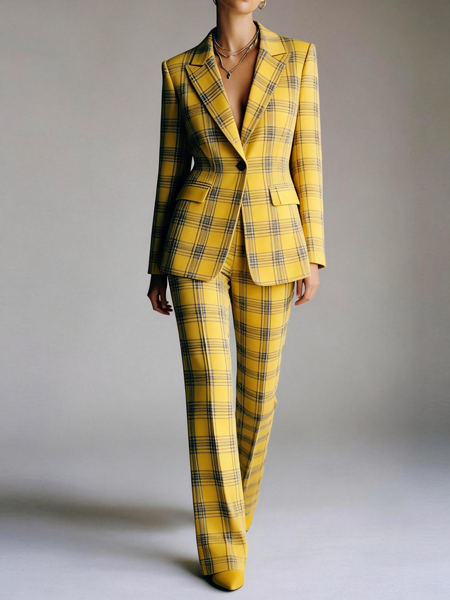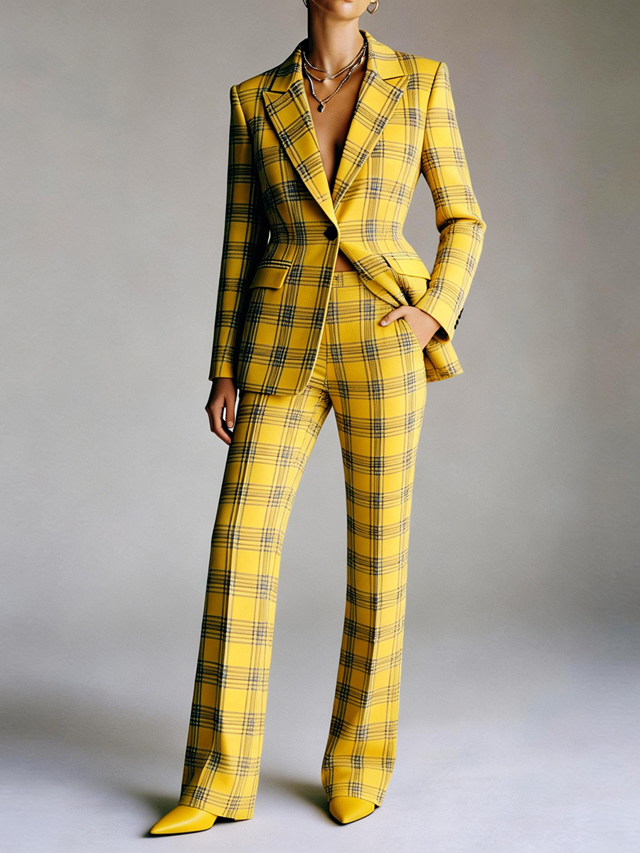 We drew inspiration from the retro flared pants of the 1990s and combined the classic frayed silhouette with the bright lemon-yellow check pattern. This design not only retains the British charm of the retro pattern but also breaks the dullness of traditional suit pants with the vibrant yellow color. The design of the slightly frayed trouser legs cleverly modifies the shape of the calf, allowing the professional outfit to have both a commanding presence and feminine charm.