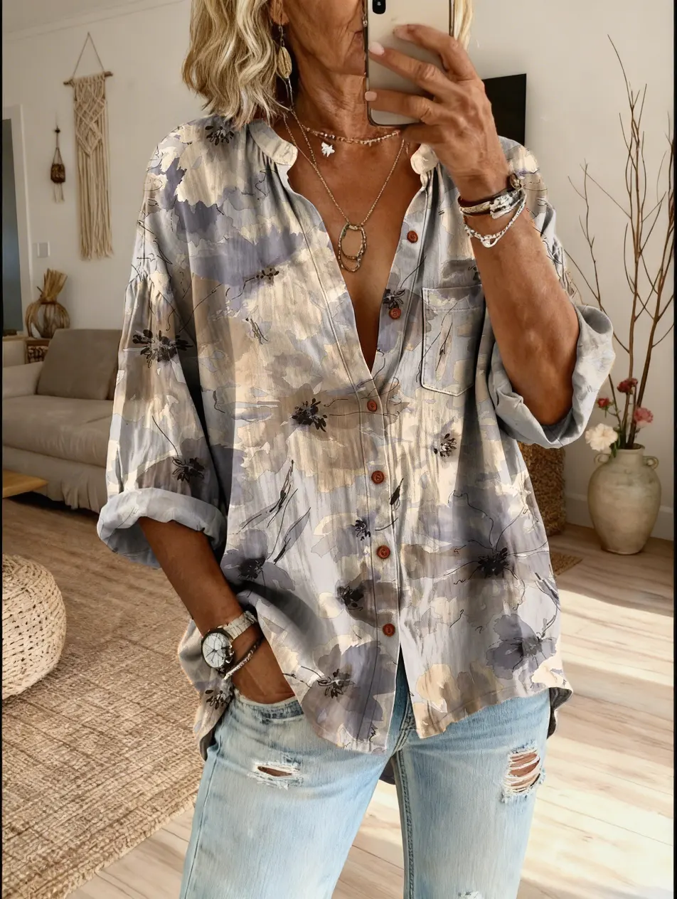 Ethnic Bohemia Flower Women's Vintage Art Print Casual Cotton And Linen Shirt