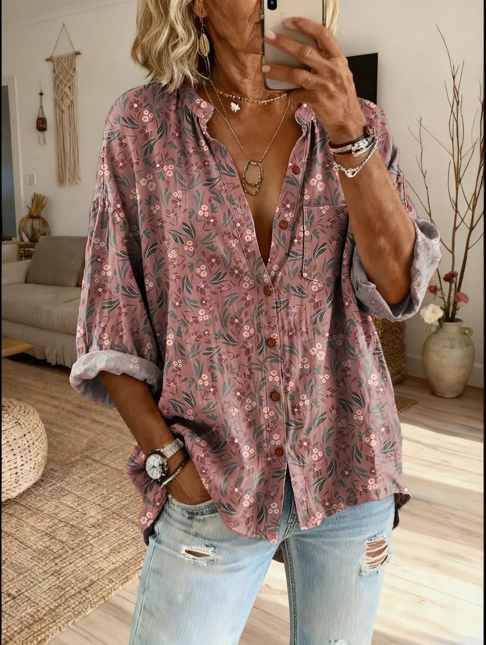 Ethnicity Bohemia Flowers Pink Women's Vintage Art Print Casual Cotton And Linen Shirt