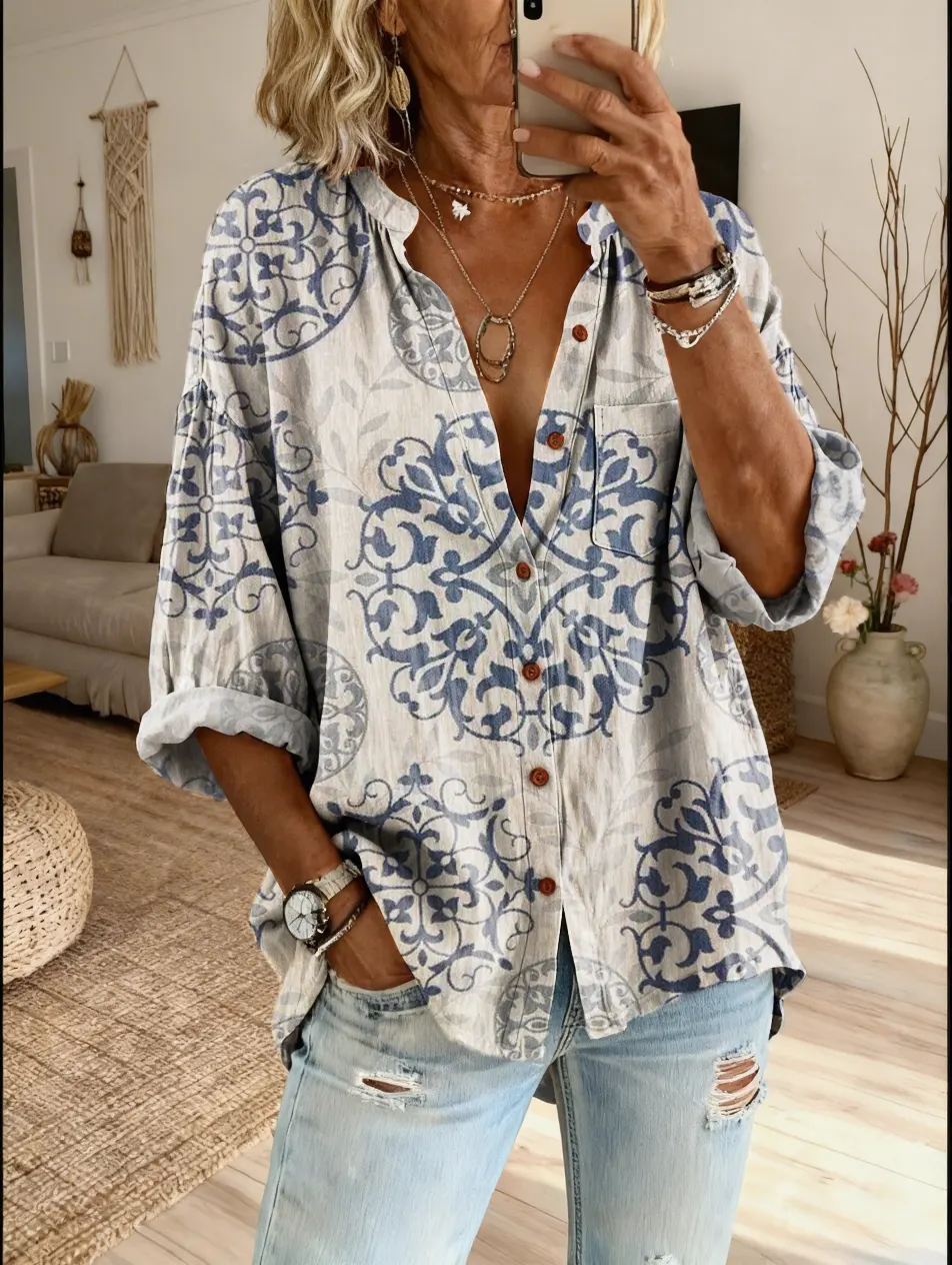 Ethnicity Geometry Flowers Totem Women's Vintage Art Print Casual Cotton And Linen Shirt