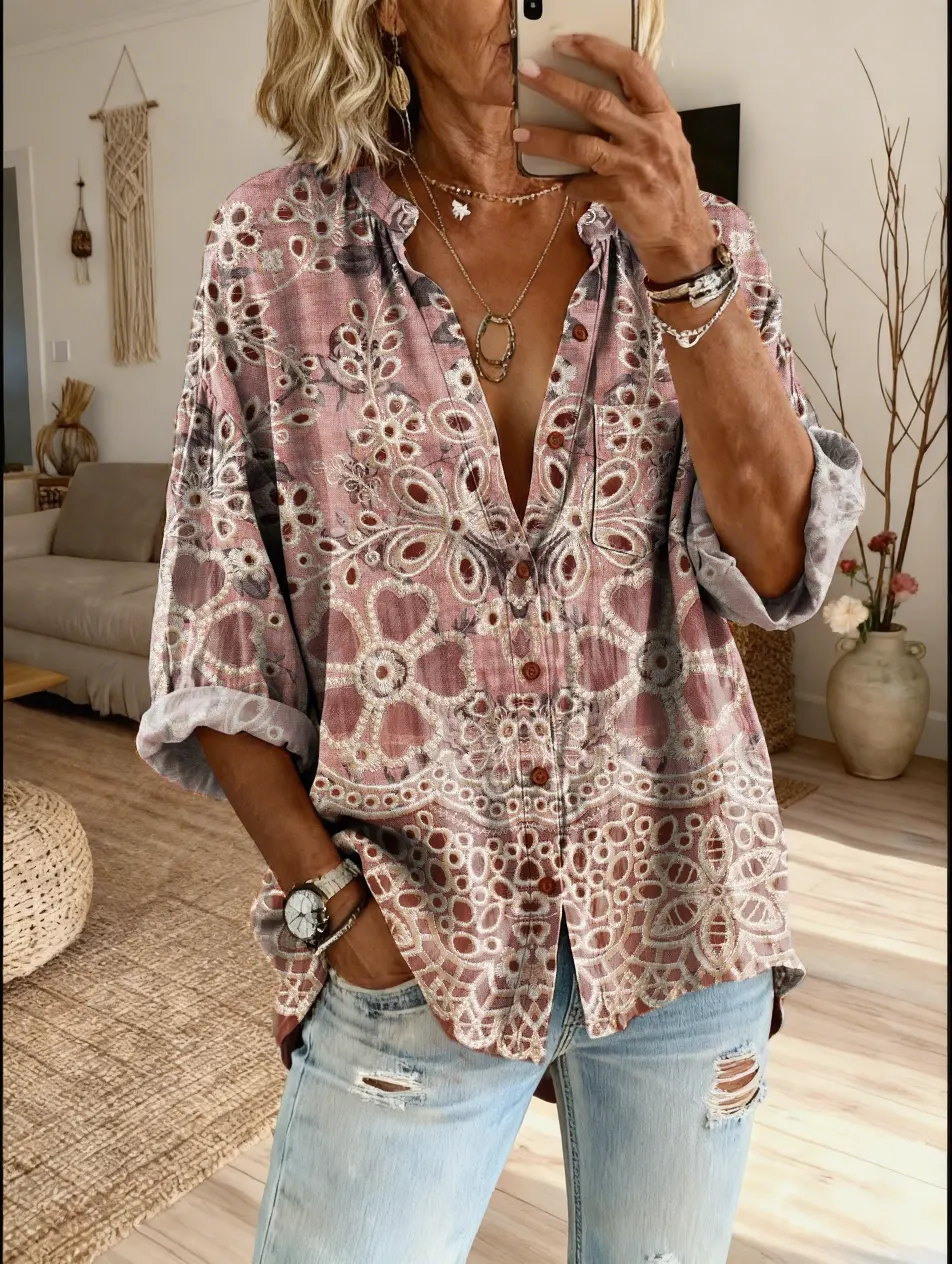 Ethnicity Texture Flowers Women's Vintage Art Print Casual Cotton And Linen Shirt