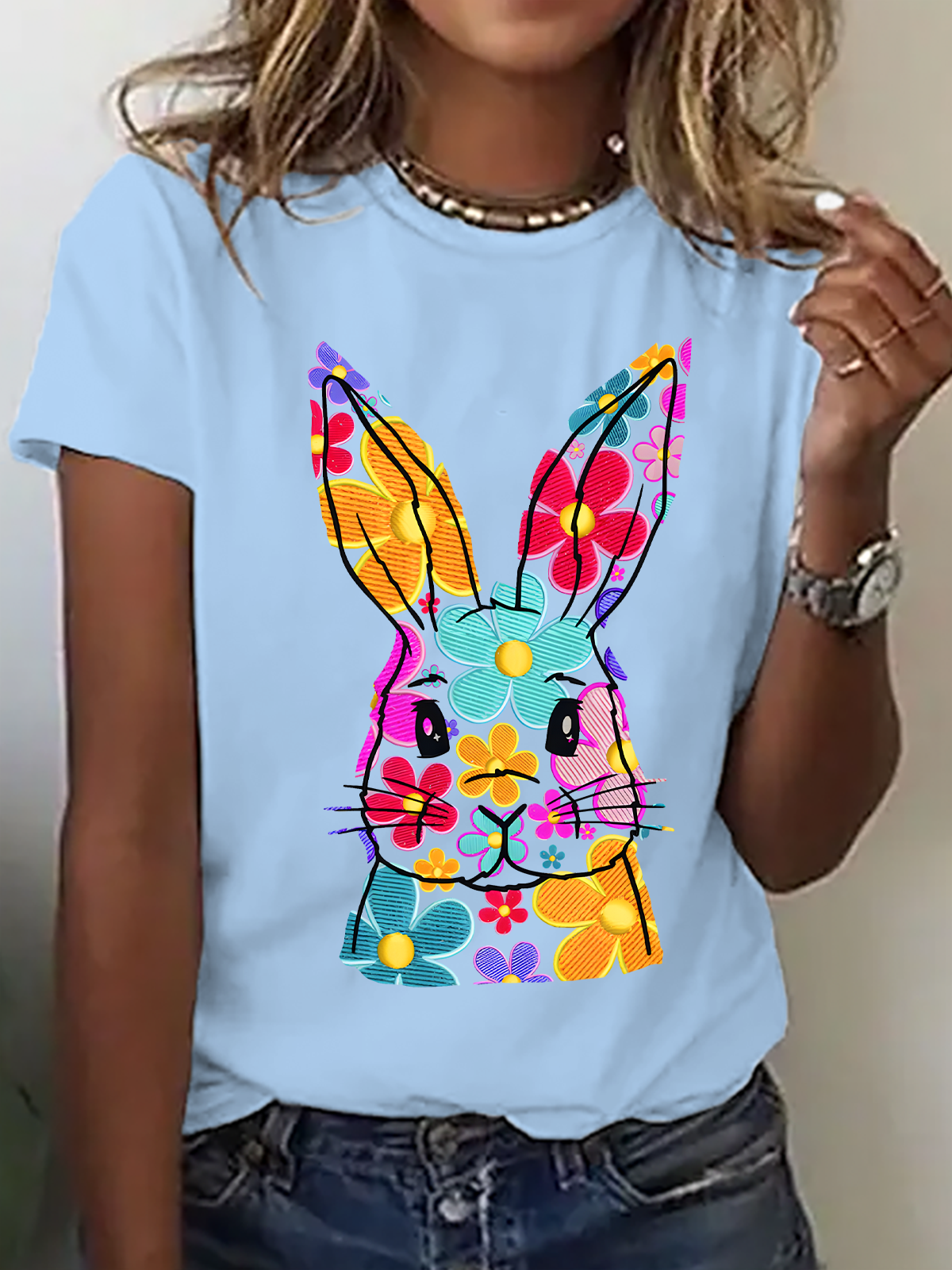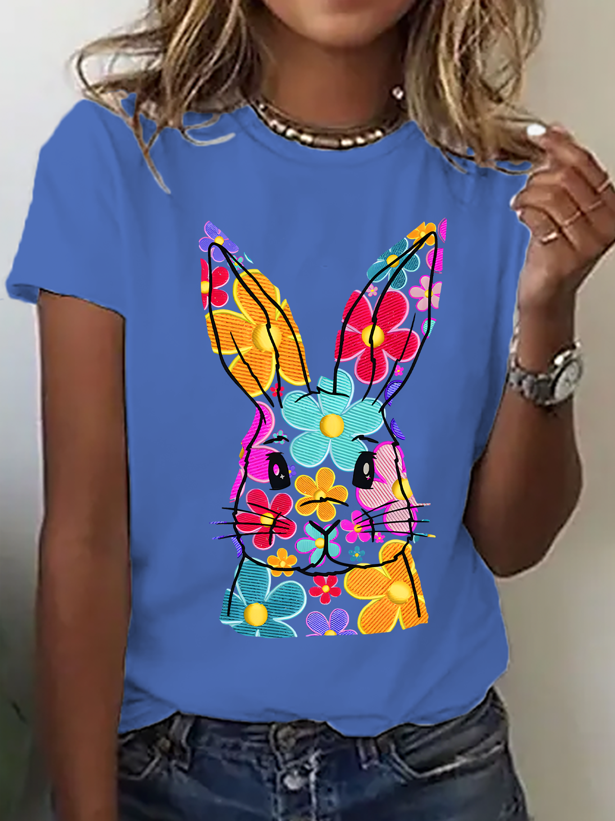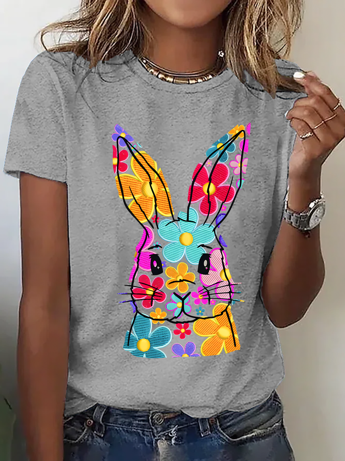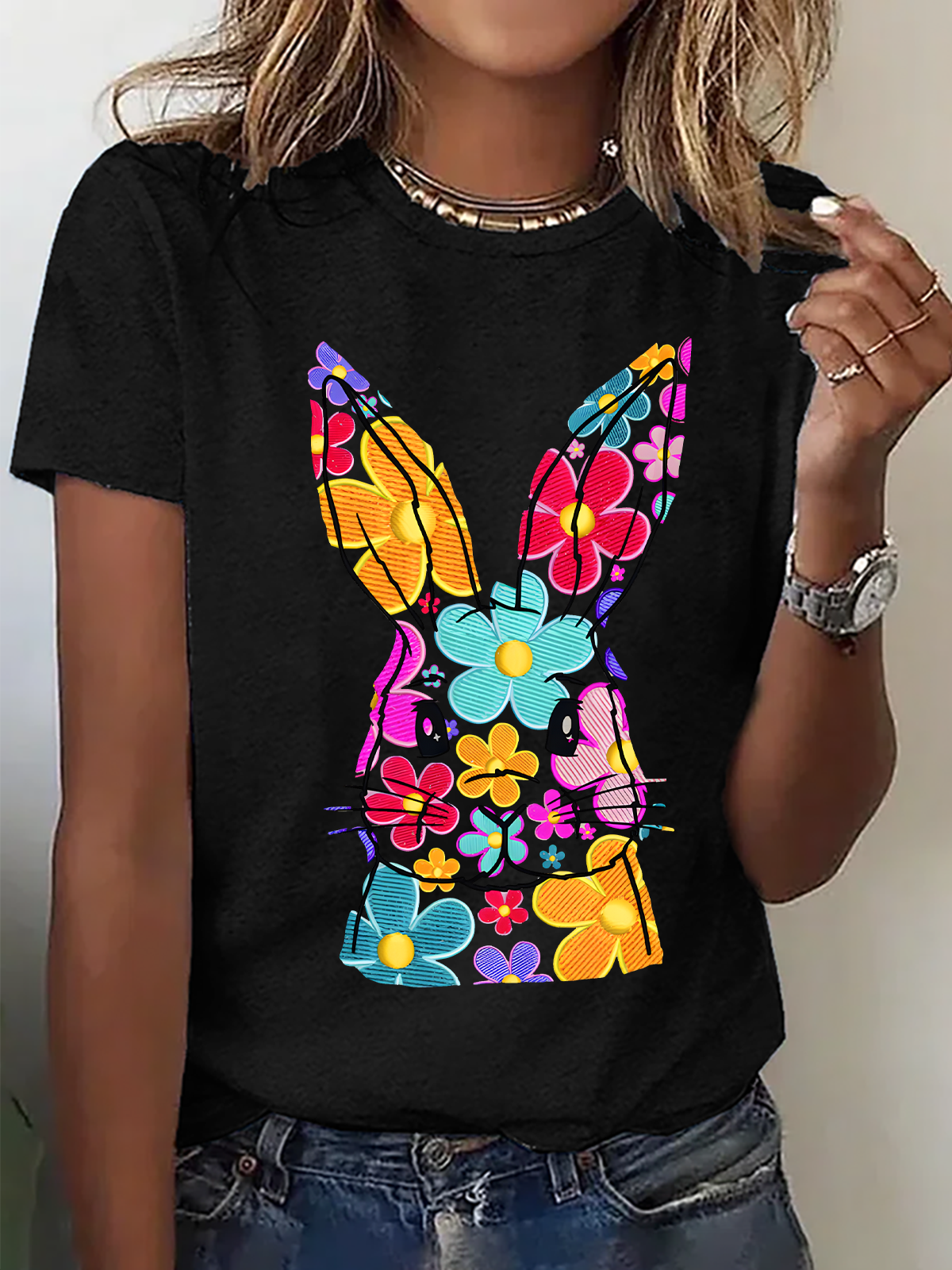 Happy Easter Bunny Flowers Print Cotton T-Shirt