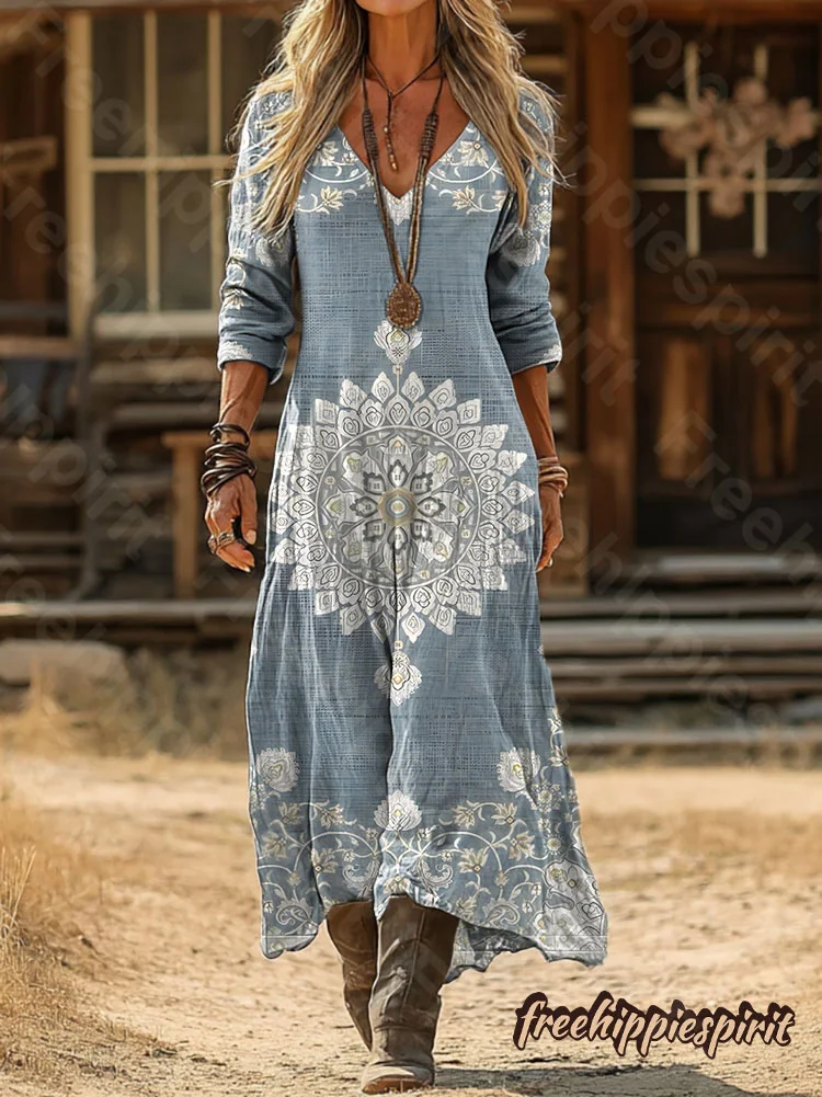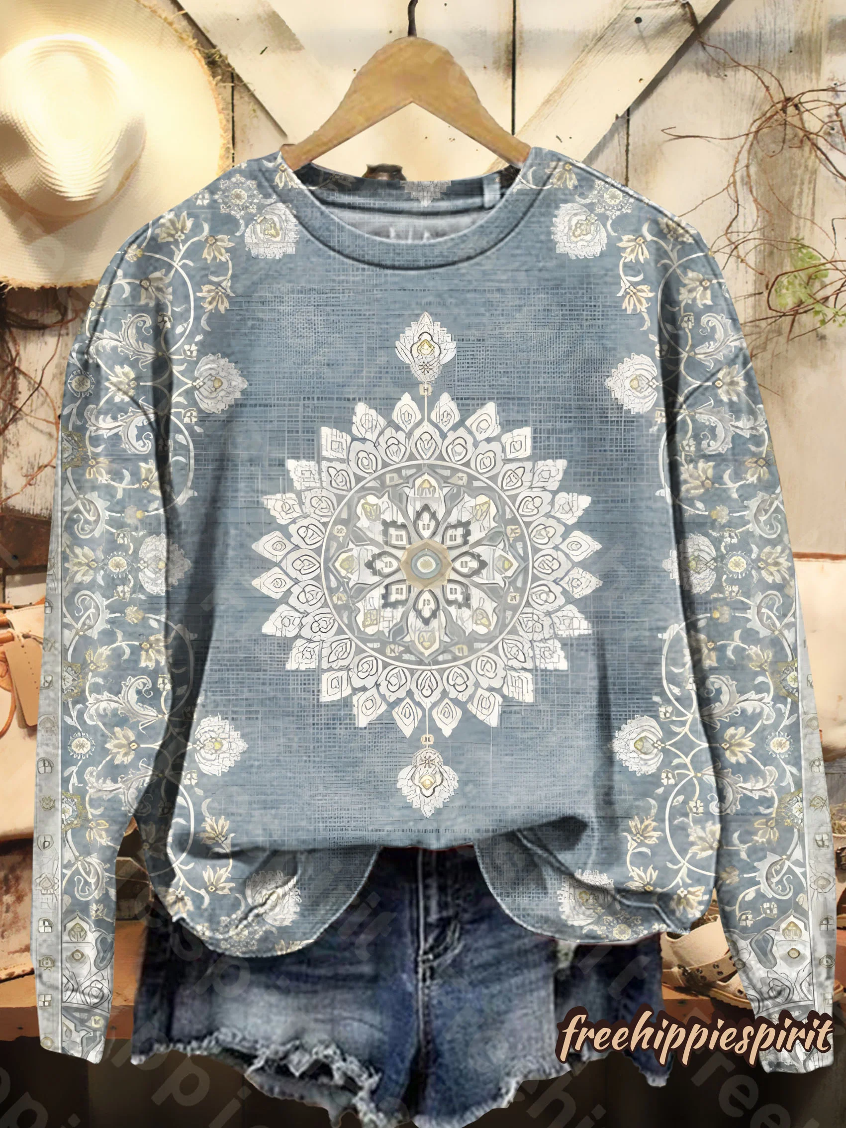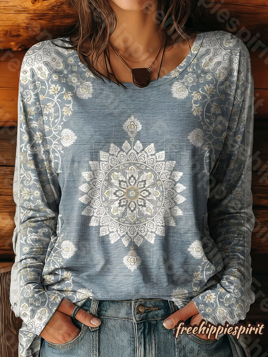 Light blue National style Flowers Women's Art Print Casual Long Sleeve T-shirt