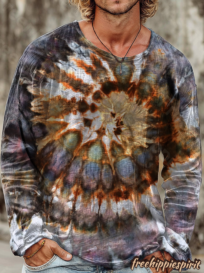 Men's Vintage Spiral Tie-Dye Art Print Casual Cotton Crew Neck Long Sleeve Shirt