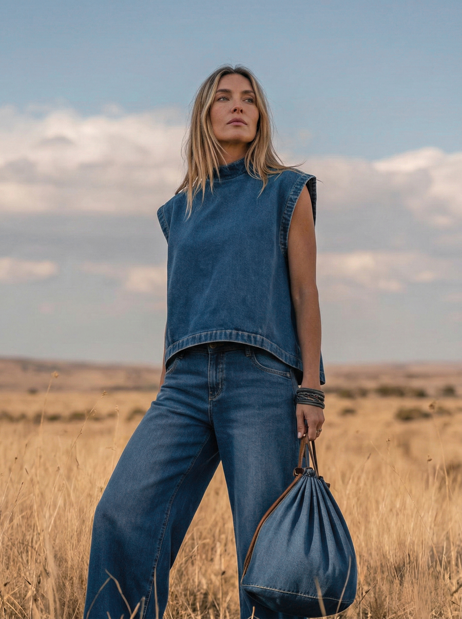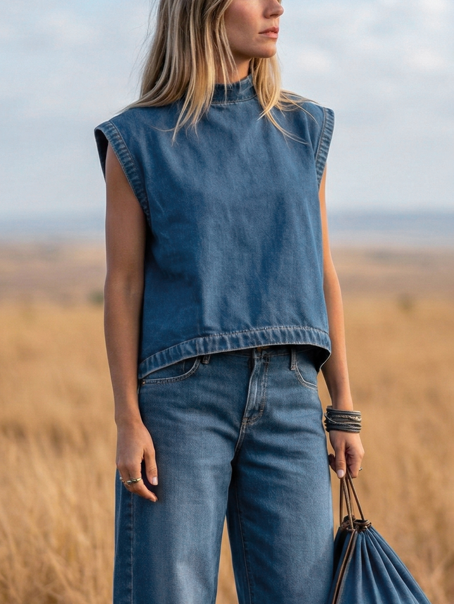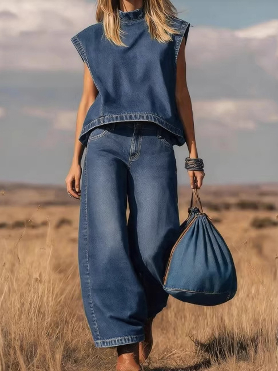 Crafted from premium washed denim, this two-piece set delivers the perfect blend of rugged charm and modern ease. The sleeveless high-neck top features a relaxed, boxy fit with wide armholes and a raw-edge hem, offering breathability and a laid-back silhouette. Paired with high-waisted wide-leg jeans, this set elongates your figure while providing all-day comfort with its roomy, flowy legs and classic five-pocket design.