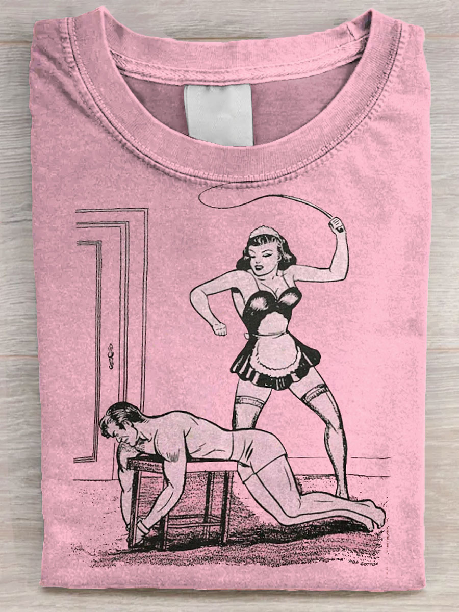 Retro Femdom French Maid Whipping Man Art Print Casual Short Sleeve T-shirt
