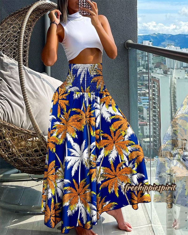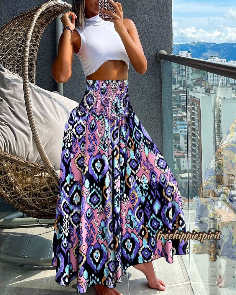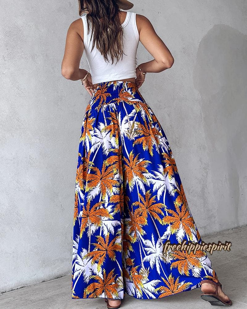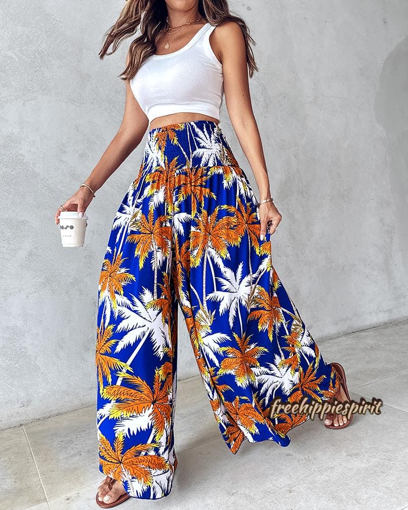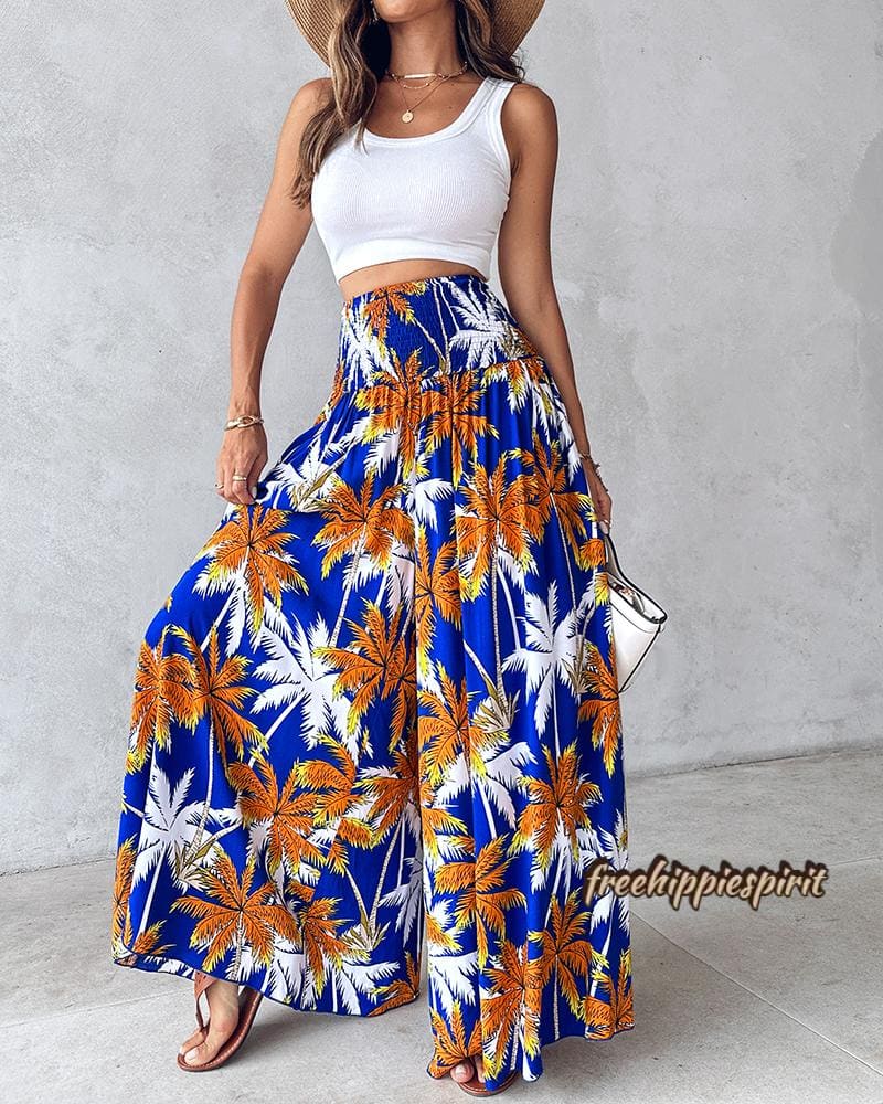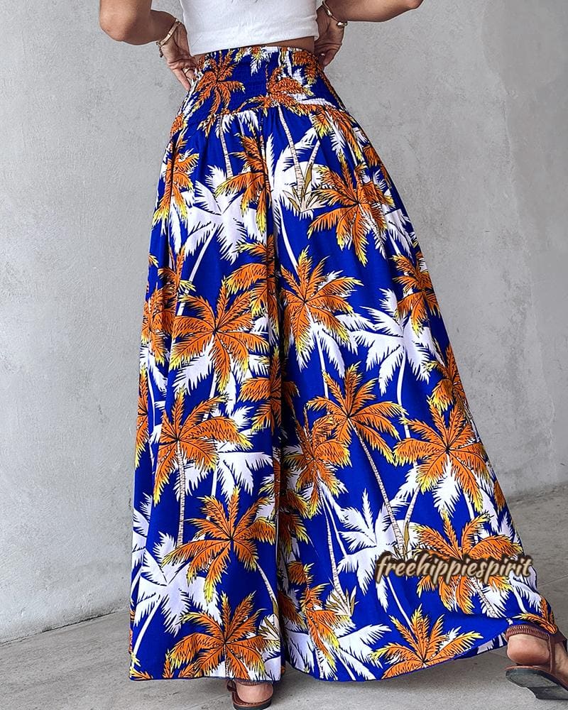 Tribal Print Shirred Wide Leg Pants