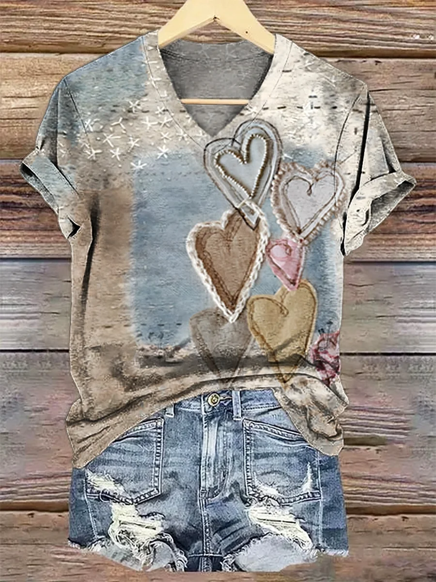 Valentine'S Day Vintage Heart Pattern Print Crew Neck T-shirt