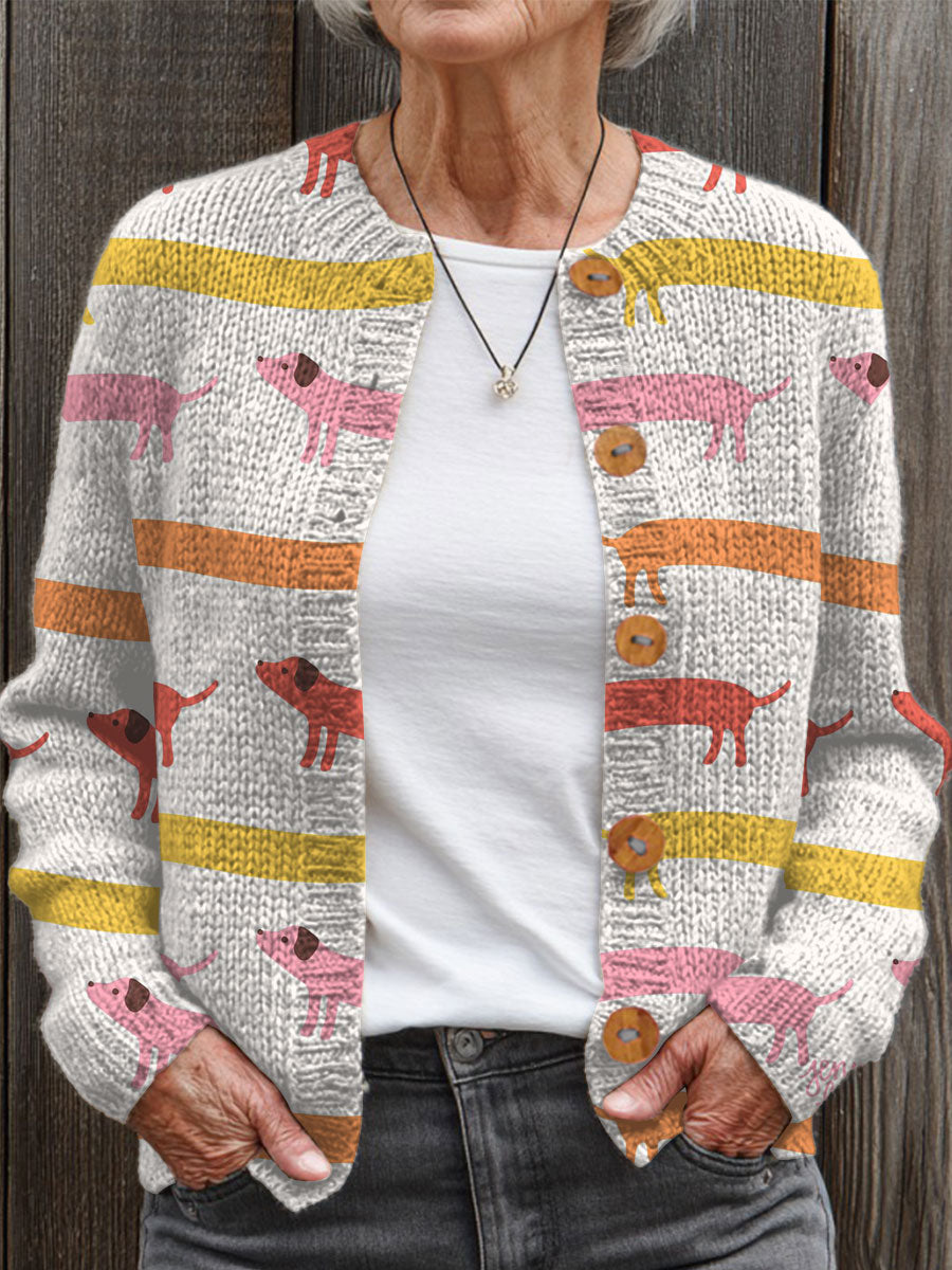 Vintage Dachshund Art Print Buttoned Cardigan Sweater