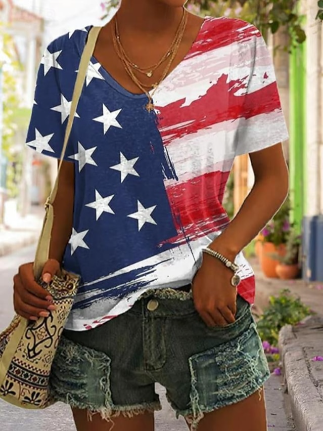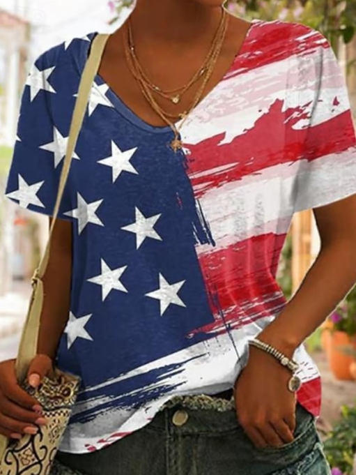 Women's American Flag Printed Casual Cotton V-Neck T-Shirt