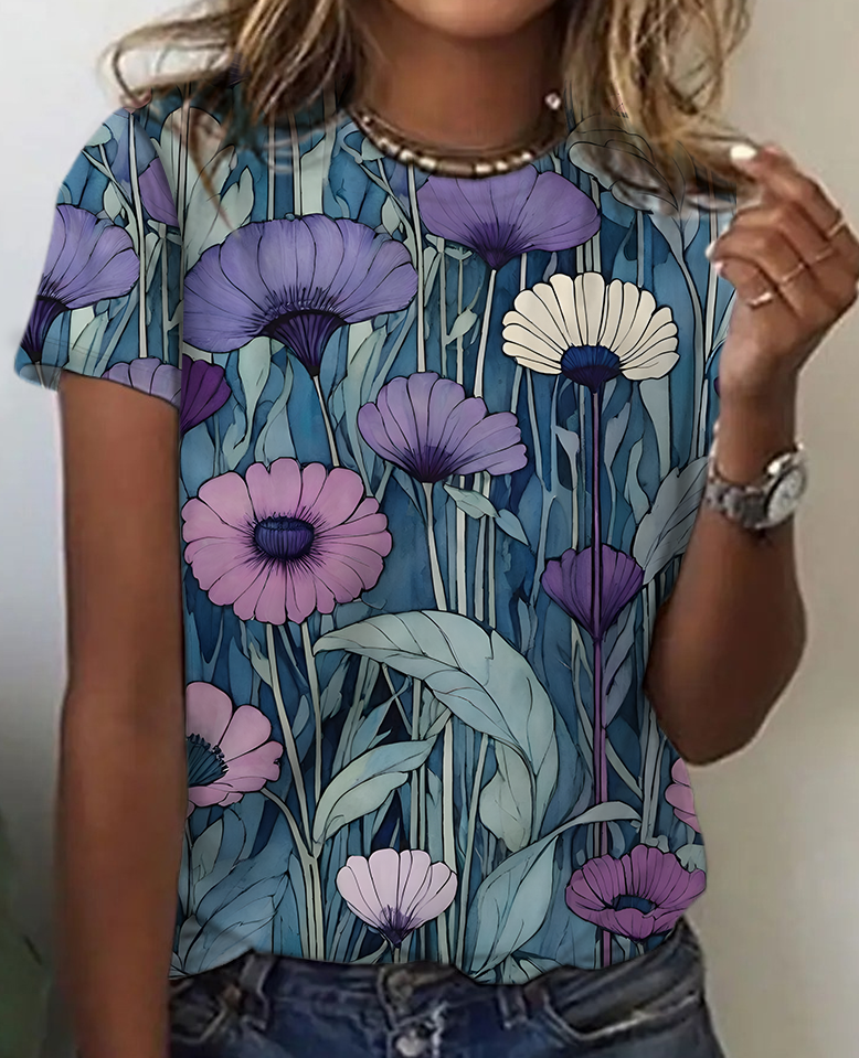 Women's Art Floral Print Cotton T-Shirt花