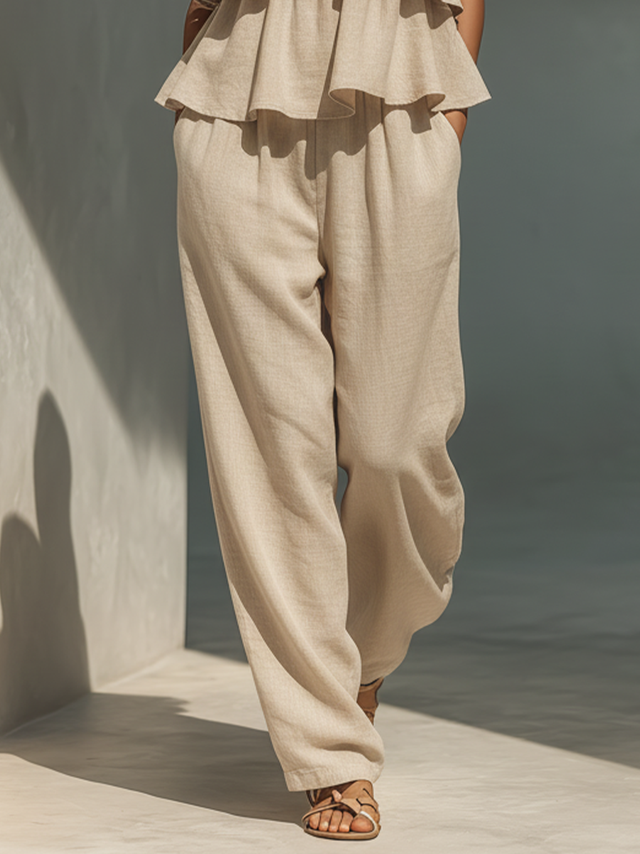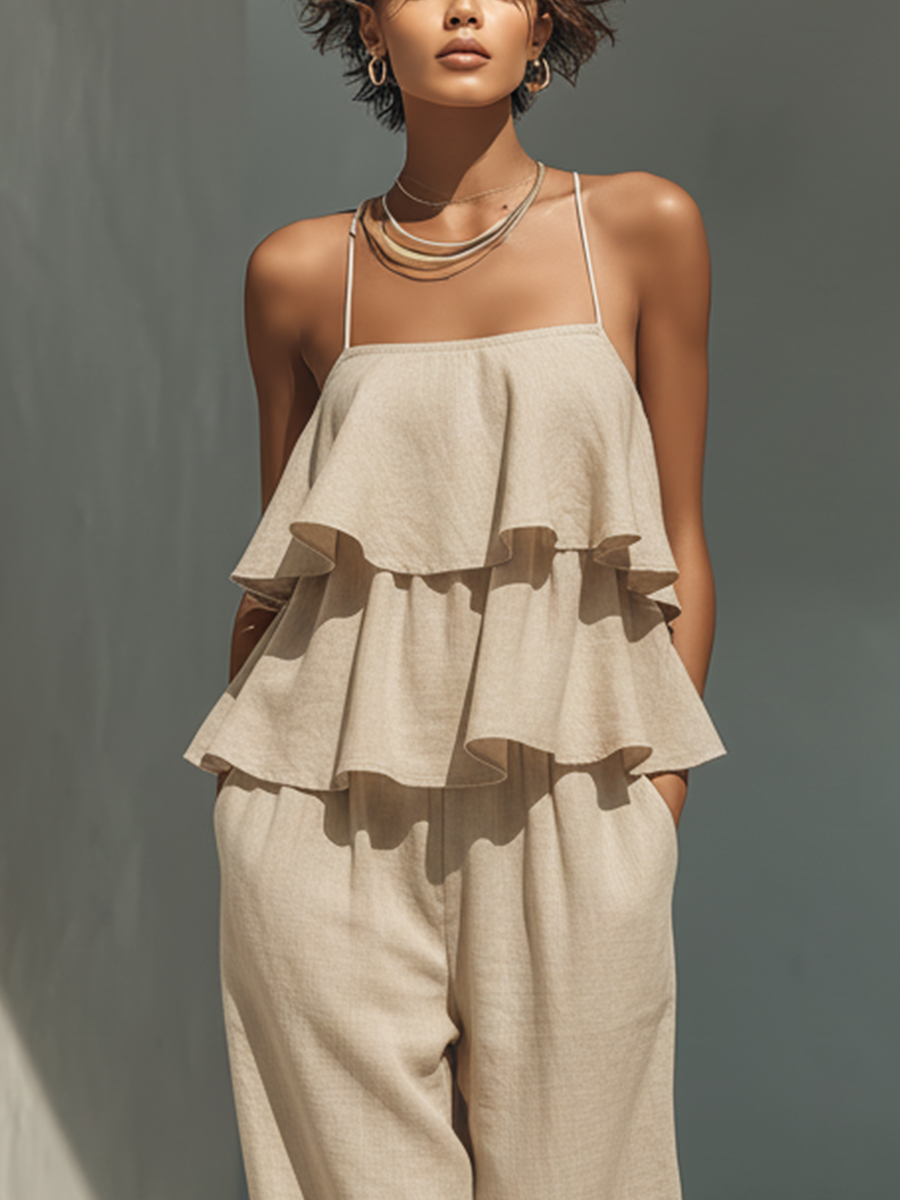 Beige linen-blend jumpsuit with spaghetti straps, tiered ruffle detail, and wide-leg styling. Light, breathable, and easy to wear for warm days.