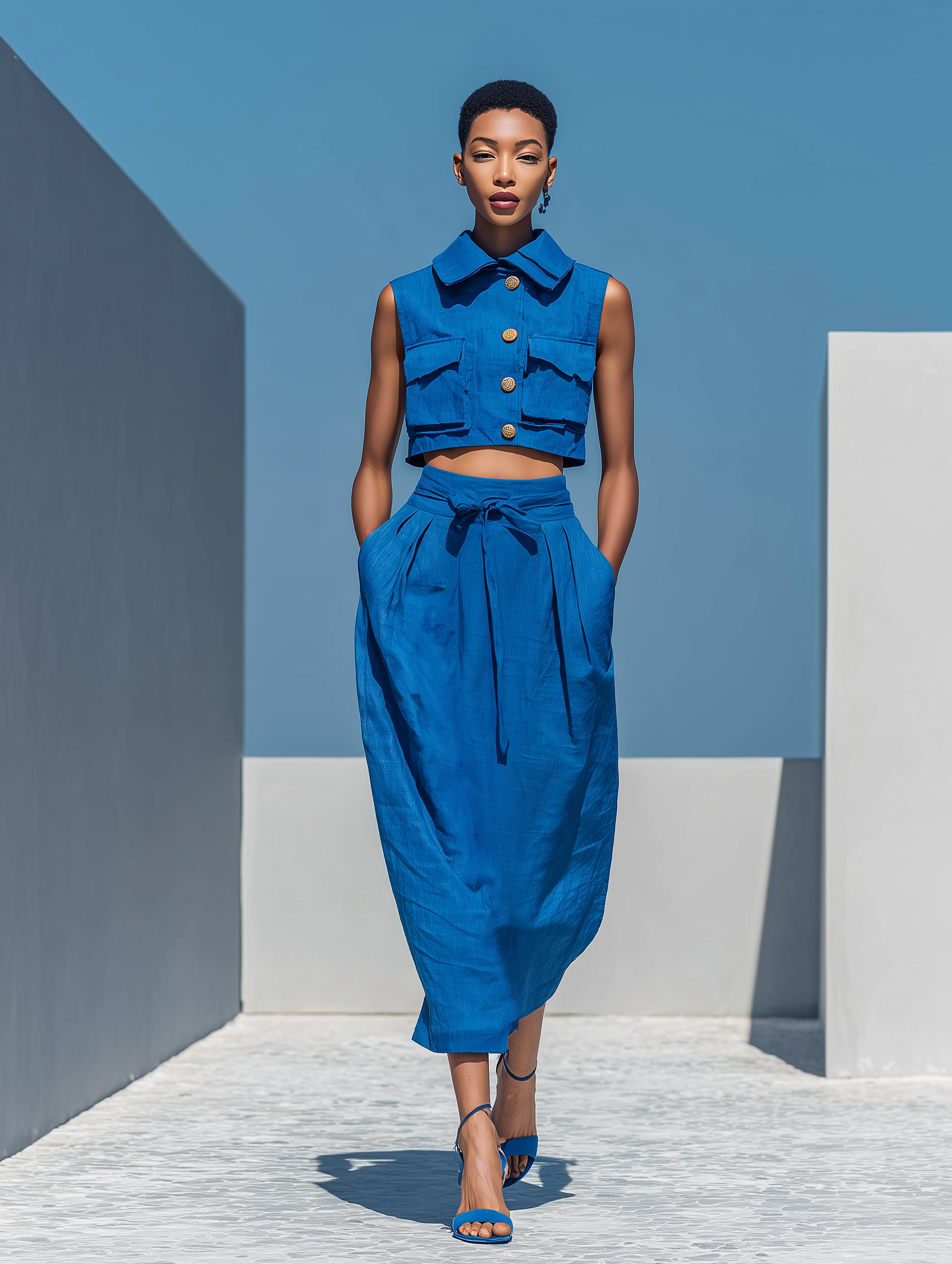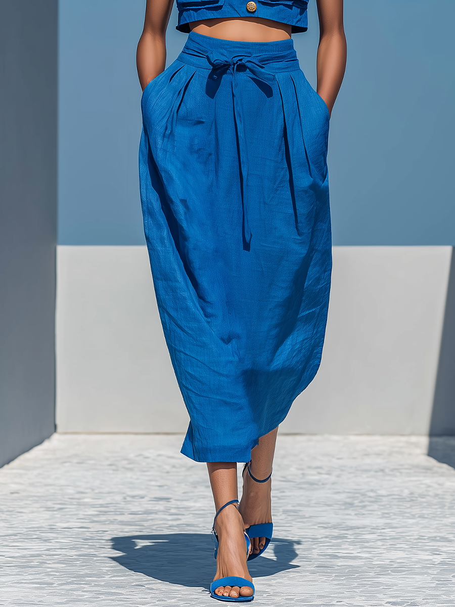 A blue linen-blend two-piece set with a sleeveless collared crop top and a high-waisted midi skirt with a tie waist for an effortless, polished look.