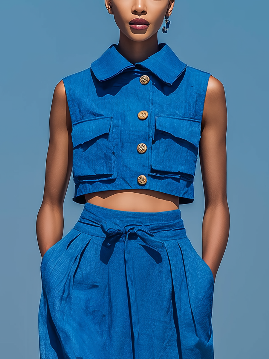 Women’s Blue Linen-Blend Sleeveless Collared Crop Top & High-Waisted Tie-Waist Midi Skirt Two-Piece Set
