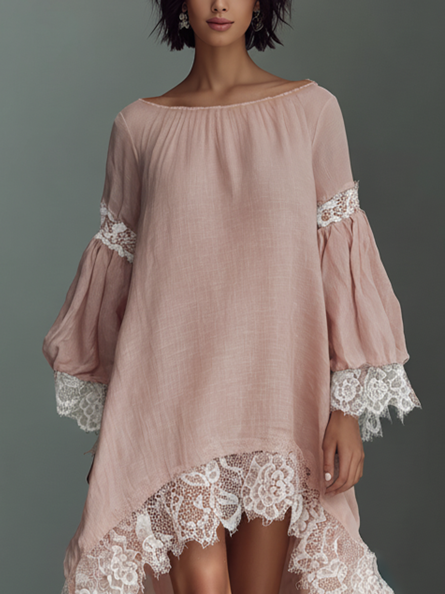A soft blush pink off-the-shoulder linen-blend midi dress with delicate lace trim and a flattering high-low hem for an airy, romantic look.